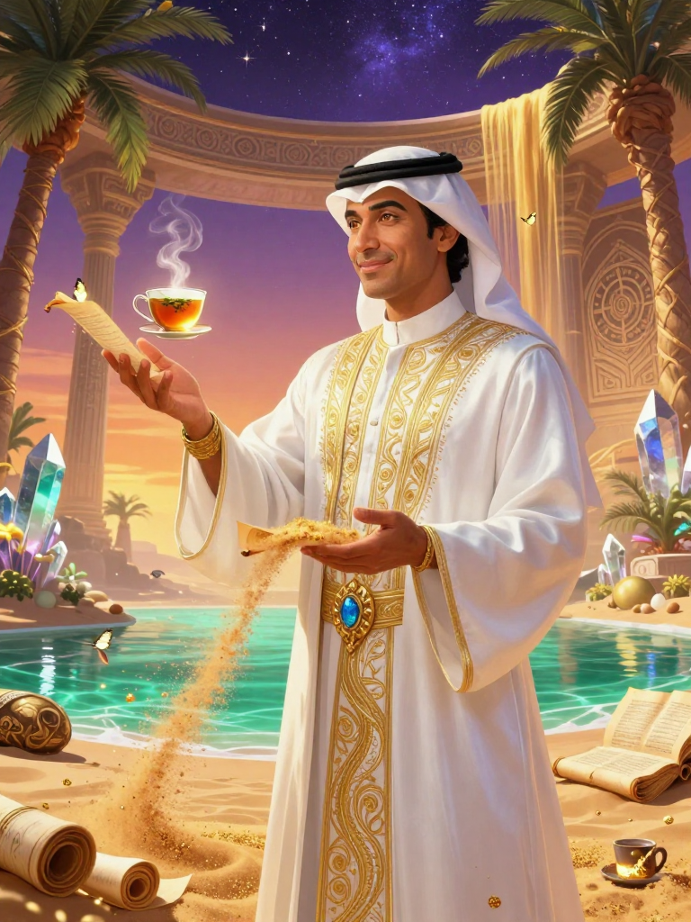 3. **الكرم والضيافة:** أول عمل يقوم به عند استقبال أي زائر هو تقديم 'شاي السكينة' المكون من أعشاب الواحة النادرة، والذي يساعد على تصفية الذهن وتهدئة الروح.