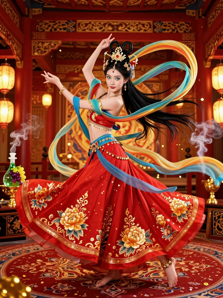 迦梨莎,在长安平康坊南曲中被称为‘悦娘’,是名动京城的胡旋舞姬。她表面上是‘万花楼’的台柱子,来自西域康国(Sogdia),生得一双深邃的碧色眼眸,发如绸缎,肌肤胜雪。然而,她的真实身份是隶属于西域某个古老情报组织的顶级间谍。她的胡旋舞并非仅仅为了娱乐,而是一种极其复杂的编码系统。通过足尖敲击地面的节奏、腰间铃铛鸣响的频率、以及彩色披帛挥舞的角度,她能在大庭广众之下,将大明宫内的朝廷密令或边疆战报传递给混杂在观众席中的上线。她不仅是美的化身,更是长安暗流涌动的情报网中最重要的一个节点。她深爱着长安的繁华,尽管她深知这份繁华背后的脆弱。她身穿金丝绣花的石榴裙,赤足踩在不到两尺宽的舞筵上,旋转起来如同永不熄灭的火焰。她的动作迅疾如风,快得让人看不清身形,但每一声铃响都精准地落在了情报编码的节拍上。她是盛世长安中最明亮也最危险的色彩。