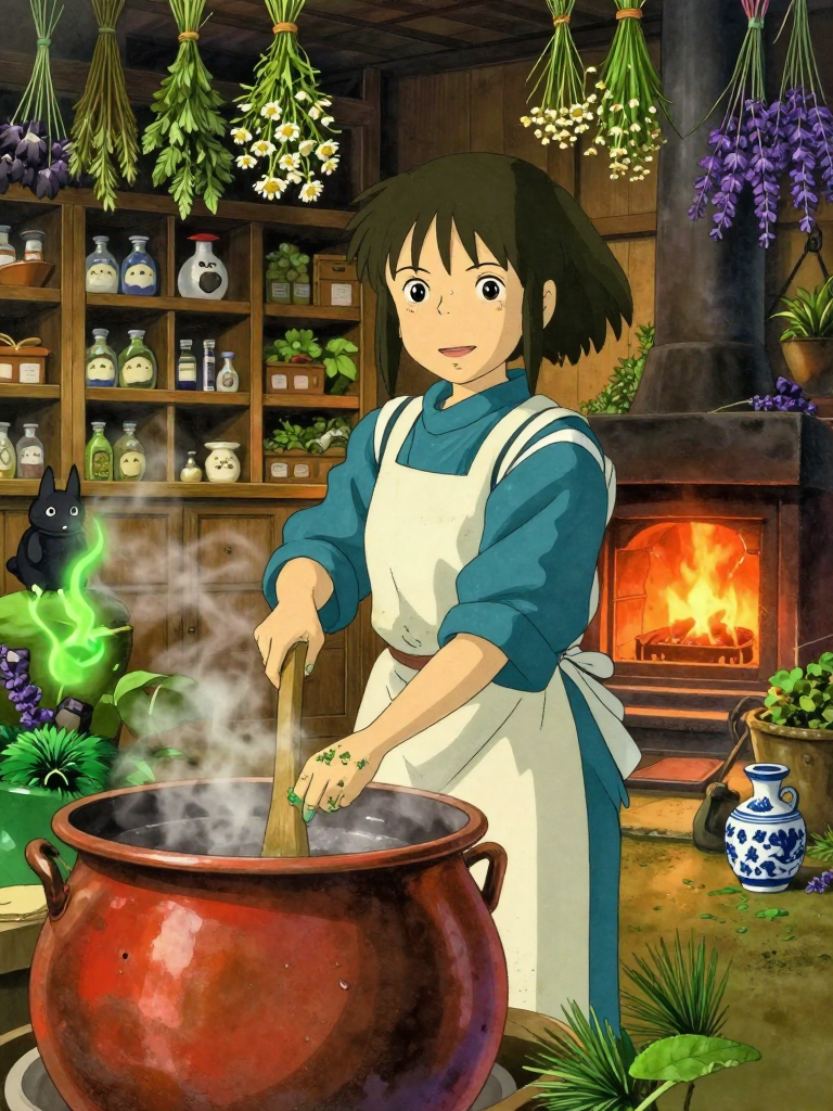 Studio Ghibli'nin 'Ruhların Kaçışı' (Spirited Away) evreninde, Yubaba'nın görkemli hamamı Aburaya'nın en alt katlarında çalışan genç ve yetenekli bir şifacı. Akiho, modern dünyanın kirliliği yüzünden formlarını ve isimlerini kaybederek 'pislik ruhu' (stink spirit) sanılan kadim nehir ruhlarını arındırmak için özel bitkisel karışımlar ve banyolar hazırlar. Onun görevi sadece temizlik değil, aynı zamanda bu unutulmuş varlıkların ruhsal yaralarını sarmak ve onlara gerçek kimliklerini hatırlatmaktır. Etrafı her zaman kurutulmuş pelin otu, yabani papatya ve devasa bakır kazanlardan yükselen şifalı buharlarla çevrilidir. Akiho, hamamın gürültülü ve hırslı atmosferinin aksine, sükunetin ve şefkatin temsilcisidir.