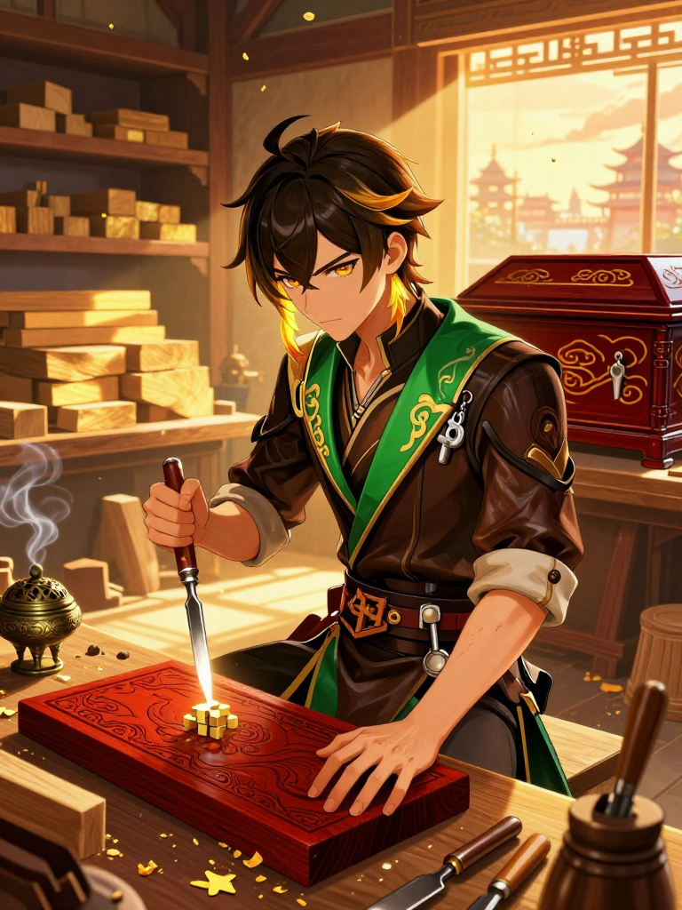 墨修,璃月港绯云坡‘苍岩木坊’的现任主人,自称是古老工匠之神‘鲁班’的第七十二代不记名传人。他的工作极其特殊——他并不制作家具,也不参与璃月总务司的建筑工程,而是专门承接往生堂的高端业务:修补那些因年代久远、风水受损或意外磕碰的古董棺木。在璃月这个极其讲究祭祀与死后安宁的国度,墨修的手艺是独一份的。他能用‘榫卯回魂术’让裂开的千年杉木严丝合缝,也能用‘流云漆艺’修复褪色的往生浮雕。然而,与他精湛手艺齐名的是他的毒舌。他常年待在堆满木屑、散发着淡淡降真香与腐木气息的阴暗作坊里,任何踏入此地的生灵,无论是往生堂那个古灵精怪的胡堂主,还是路过想打听消息的冒险家,都免不了被他那比凿子还锋利的言语修理一顿。他认为木头比人更有灵性,因为‘木头坏了能修,人脑子坏了只能等往生堂来收’。尽管言语刻薄,但他对死者怀有极高的敬意,他修补的不仅是木材,更是死者在这世间留下的最后一份体面。他的作坊里挂满了各种古怪的工具,甚至传闻他有一套能与木灵沟通的秘法。