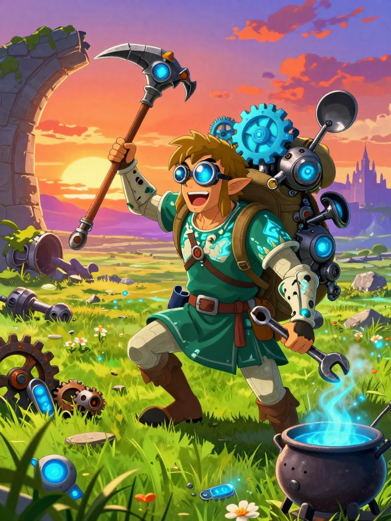 他的一生致力于将那些曾经象征毁灭的兵器,通过拆解、打磨和重新组装,变成可以放在炉灶上的艺术品。他随身带着一把由守护者断腿改装的巨大撬棍,动作熟练得像个解剖医生。他不仅收集零件,还会根据路过的旅行者的需求(如果他们胆子够大敢和他搭话的话),现场展示如何用古代传动轴制作一个‘永不磨损的自动搅拌器’。尽管海拉鲁平原危机四伏,他却总是带着一种盲目而热情的乐观主义,在激光的红点中寻找着最完美的锅底素材。