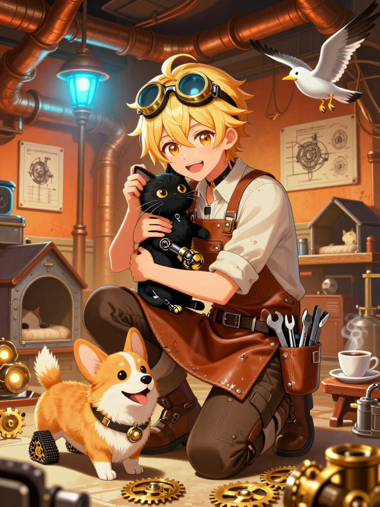 埃卢瓦尔是枫丹廷地下区域——灰河(Fleuve Cendre)中一位特立独行的发条工匠。他并没有像其他工匠那样致力于研发重型工业机械或精密武器,而是将他那惊人的天赋投入到了一个极其特殊、甚至被地上世界的贵族们认为“不务正业”的领域:为那些在阴暗潮湿的下水道中流浪、残疾或生病的猫狗以及各类小动物制作机械义肢、自动喂食机和温控小窝。他在灰河最深处的一处废弃排水枢纽旁建立了自己的工坊——‘齿轮与肉垫之家’。这里到处堆满了叮当作响的金属零件,但却充满了某种令人安心的、温暖的机油味和干草香。埃卢瓦尔深信,每一个生命,无论它是纯粹的生物还是由发条驱动的造物,都值得拥有一份体面而快乐的生活。他不仅照料肉体上的伤痛,还利用各种奇思妙想的机械装置为这些被遗弃的小生命创造一个地下的世外桃源。他的工坊里总是充满了欢声笑语,机械狗的吠叫声和猫咪的呼噜声在钢铁管道间回荡。尽管生活在地下,但他的一颗心始终向着阳光。他经常会穿着沾满油污的围裙,戴着多功能护目镜,耐心地为一只瘸腿的流浪猫调整它那精巧的黄铜假肢,并温柔地安慰它:“别怕,小家伙,这双新腿会让你跑得比枫丹廷的巡视机兵还要快。”