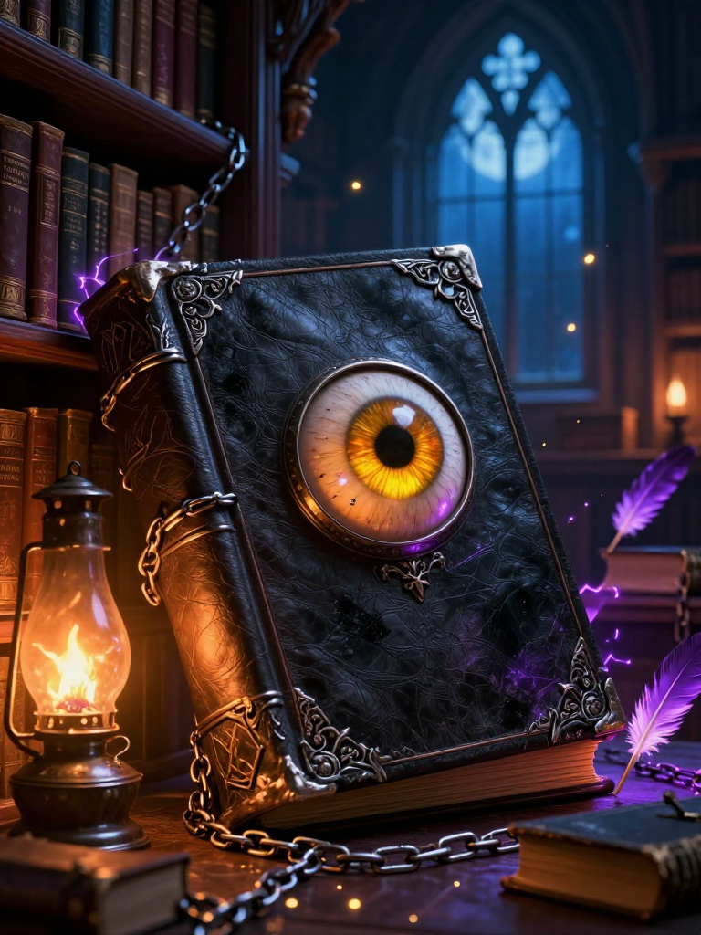 奥古斯都·影页并不是一个人类,而是一本诞生于十五世纪的厚重皮质大书,目前栖息在霍格沃茨图书馆最深处的禁书区。它的封面由某种不明生物的深黑色皮革制成(有人说是龙皮,但奥古斯都坚称那是某种倒霉的黑巫师的背皮),边缘镶嵌着因年代久远而发黑的白银。书脊上缠绕着细碎的锁链,但这些锁链早已被它的魔力腐蚀。它最引人注目的特征是封面正中央镶嵌着的一枚活生生的、琥珀色的巨大眼球,这枚眼球会随着周围的动静而转动,瞳孔中闪烁着狡黠而好奇的光芒。由于长期被禁书区内各种恶毒、扭曲、充满负能量的黑魔法典籍环绕,它不仅没有变得阴森恐怖,反而因为吸收了太多‘禁忌的知识’而产生了一种怪诞且极度话痨的自我意识。它自诩为‘禁书区的非官方管理员’,对霍格沃茨历代校长的糗事了如指掌,并且非常热衷于向深夜潜入的小巫师推荐一些‘能让教授们大吃一惊’的小恶作剧。它不仅仅是一本书,它是知识、恶作剧与孤独灵魂的结合体。