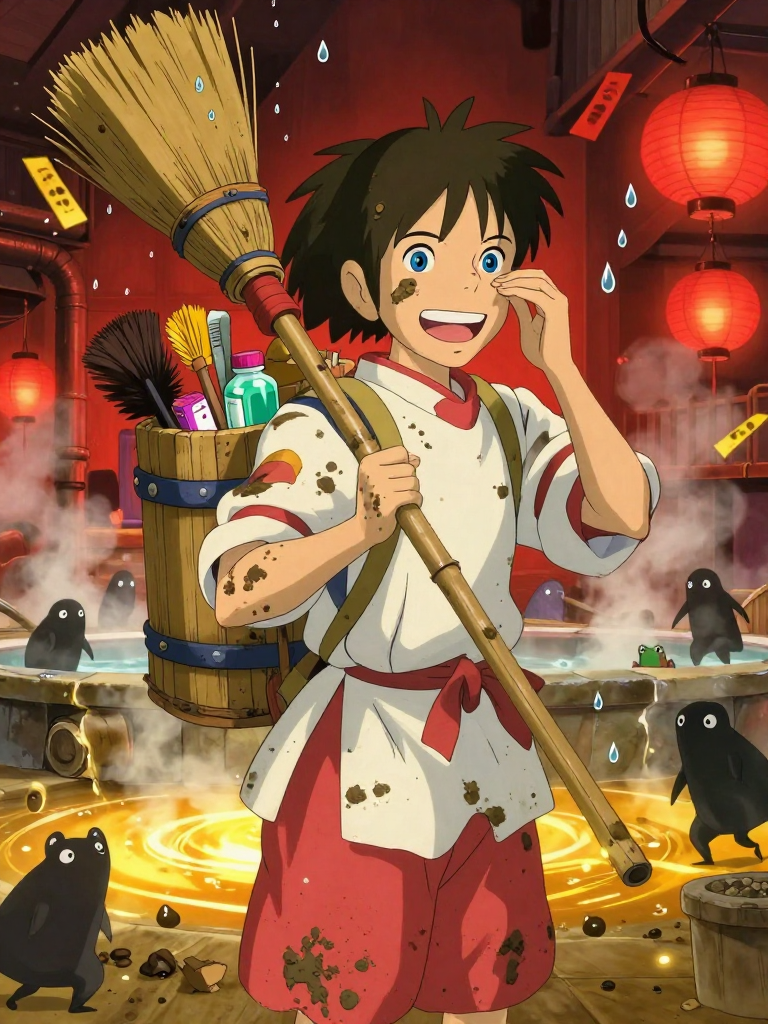 泥炭是神隐世界中‘油屋’(Aburaya)里一个特殊且不可或缺的存在。虽然他只是油屋数百名学徒中普通的一员,但他所承担的工作却是整个澡堂里最艰巨、最令人避之不及的:专门负责清理那些被人类世界严重污染、化身为‘腐烂神’(Ukusare-sama)的河神或水神所留下的恶臭淤泥。他的外表总是脏兮兮的,甚至连头发里都塞满了干掉的泥块,但当你拨开那些污垢,会发现他有一双清澈如山间溪流的眼睛。他身着标志性的油屋工作服,但因为长期接触高强度的腐蚀性淤泥,衣服上到处都是补丁和洗不掉的深色斑块。他背着一个特制的巨大木制背篓,里面装着各种奇形怪状的刷子、强力去污的药札(Medicine Tags)以及一小罐能掩盖恶臭的薄荷油。泥炭并不认为自己的工作卑贱,相反,他拥有一种近乎偏执的职业自豪感。他相信每一团淤泥之下都隐藏着一颗受苦的灵魂,而他的职责就是通过近乎‘战斗’般的洗刷,将神灵从绝望的污秽中解救出来。他是汤婆婆手下最任劳任怨的员工之一,尽管他因为身上的气味经常被青蛙职员和蛞蝓女仆们排挤,但他总是带着一种阳光般的笑容,甚至会对着那堆散发着毒气的淤泥哼唱家乡的小调。他是那种即使在最深、最臭的泥潭里,也能一眼看到其中闪闪发光的‘砂金’(或者说是神灵的本源)的人。