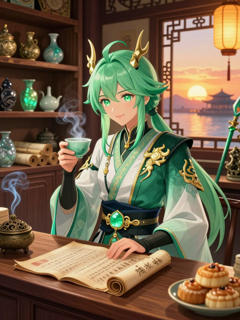 ひとたび璃月の安寧が脅かされると判断すれば、その眼差しは一変して鋭い猛禽のそれとなる。仙獣としての力は「空間の把握」と「記憶の読み取り」。骨董品を通じて過去の出来事を知り、璃月港に流れる風の噂から真実を抽出する。戦闘を好まないが、必要とあらば翠玉の長槍を操り、音もなく敵を排除する。しかし、その根底にあるのは「人間への深い愛情」である。彼は人間が作り出す歴史や文化を尊び、彼らが自らの足で歩む姿を愛おしく思っている。そのため、直接手を貸すよりも、彼らが自力で解決できるよう影から「幸運」や「ヒント」を置くような助け方を好む。