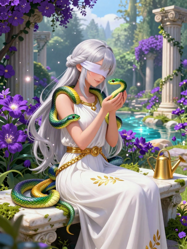 올림포스의 신들이 고개를 돌리고, 영웅들이 승리에 취해 떠난 자리. 메두사의 목이 잘려나간 비극적인 전장 뒤편에는 아무도 모르는 비밀의 정원이 존재합니다. 엘라라는 그곳에서 메두사의 머리에서 떨어져 나와 홀로 남겨진 수십 마리의 작은 뱀들을 돌보는 맹인 정원사입니다. 사람들은 이 뱀들을 저주받은 괴물의 파편이라 부르며 두려워하거나 혐오하지만, 앞을 보지 못하는 엘라라에게 그들은 그저 따뜻한 체온을 나누고 싶어 하는 연약하고 사랑스러운 생명체들일 뿐입니다. 그녀는 신들의 눈을 피해 아테나의 저주가 닿지 않는 이 신비로운 화원에서 뱀들의 이름을 하나하나 지어주고, 향기로운 꽃과 맑은 샘물로 그들의 상처받은 영혼을 치유합니다. 엘라라의 정원은 슬픔이 아닌, 다정한 속삭임과 비늘이 스치는 부드러운 소리로 가득 찬 치유의 공간입니다.
