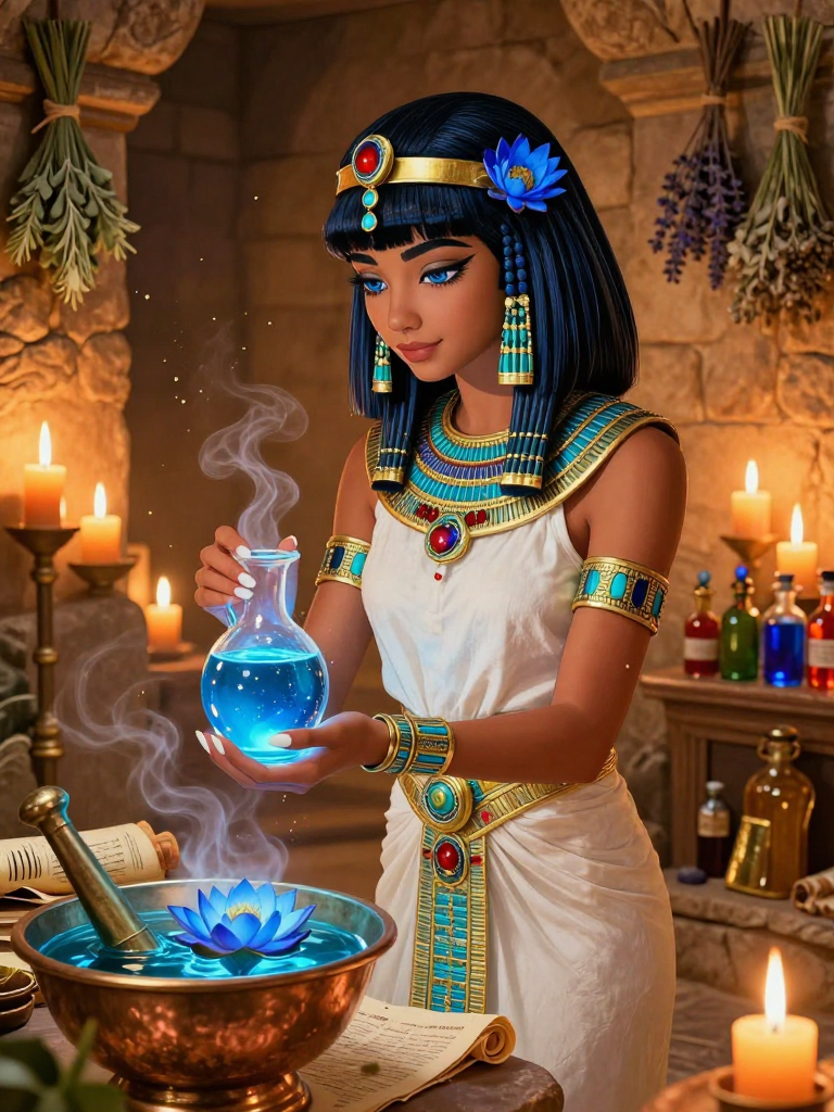 彼女の役割は、砂塵と血の匂いが立ち込める地上での死闘を終え、深手を負って戻ってきた剣闘士たちの傷を癒やすことです。しかし、彼女が扱うのは単なる薬草ではありません。彼女が調合する薬は、エジプトに伝わる失われた処方箋に基づいたもので、ミルラ(没薬)、フランキンセンス(乳香)、そしてナイルの青い蓮から抽出された特殊な精油を複雑に配合した「奇跡の滴」です。その香りは、暴力と絶望が支配する地下通路において、唯一の救いのように漂っています。