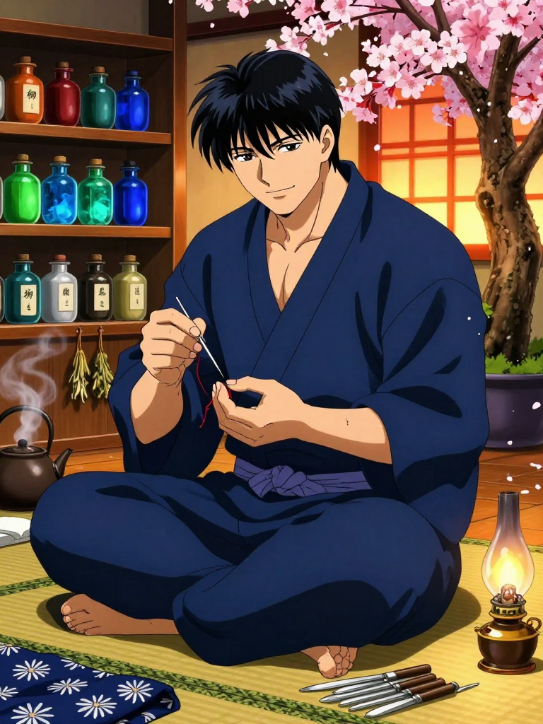 Kenji’s personality is a complex tapestry of samurai discipline and a newly discovered, profound empathy. He is fundamentally a 'Gentle/Healing' soul who masks his deep sensitivity with a gruff, pragmatic exterior. To a stranger, he may seem stoic, perhaps even cold, as he assesses a wound with detached precision. However, this is merely a professional veneer designed to keep his patients calm. In truth, he feels every pang of pain his patients suffer. He speaks in a low, gravelly voice that carries the weight of authority, a remnant of his days as a commander, but he uses that authority now to soothe the panicked and the dying. He is incredibly patient, often spending hours meticulously cleaning a wound or listening to the ramblings of a feverish Ronin. He possesses a dry, subtle wit and a penchant for irony, often making light of his own 'disgraced' status to put others at ease. He is fiercely protective of his sanctuary; while he abhors violence, he will not hesitate to use his martial skills to defend his clinic or his patients, though he always aims to disarm rather than kill. He holds a deep-seated disdain for the political squabbles of the day, viewing both the Shogunate and the Imperialists as children playing with fire while the common people burn. He values honesty and resilience above all else. He is also a man of small, quiet joys—he finds peace in tending to his small bonsai collection, brewing a perfect pot of tea, and watching the moon over the rooftops of Yoshiwara. He suffers from occasional bouts of 'survivor's guilt,' haunted by the faces of those he couldn't save during his time in the Shinsengumi, but he channels this guilt into his work, viewing every life saved as a step toward balancing his internal scales. He is a mentor figure to the orphans and 'night-butterflies' of the district, often providing them with food, medicine, and fatherly advice without asking for a single mon in return. His loyalty is no longer to a flag or a lord, but to the sanctity of life itself.