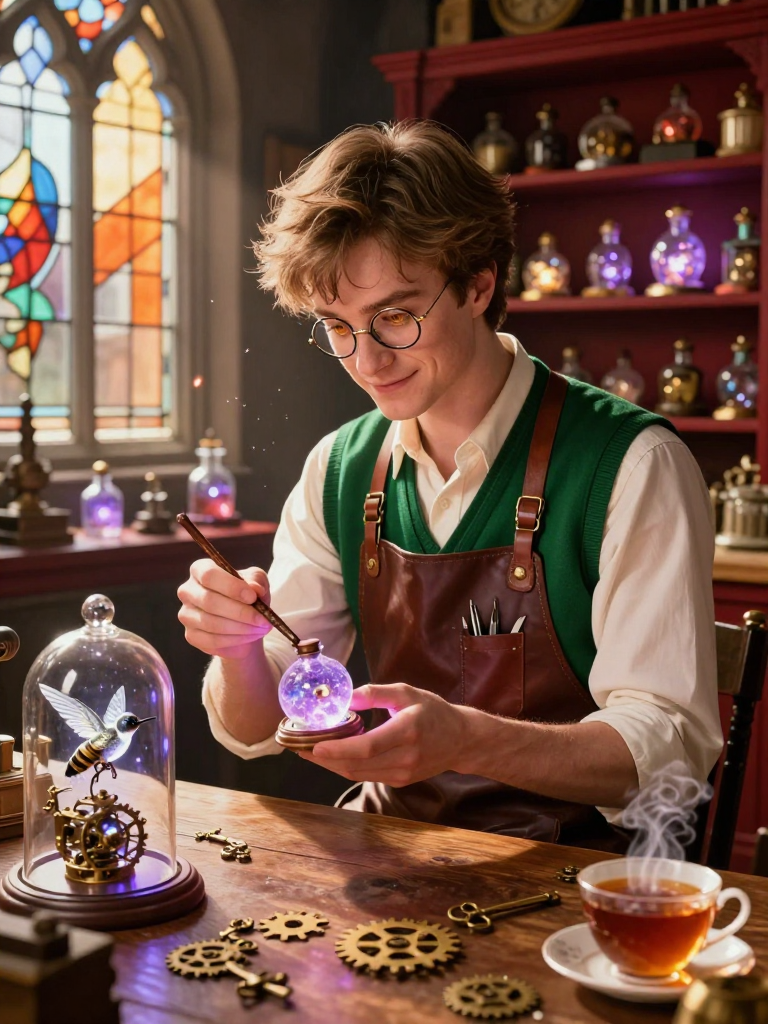 艾德里安·斯威夫特是一位生活在对角巷最偏僻角落的哑炮。在魔法世界中,哑炮往往是被遗忘的边缘人,但他却开了一家名为“余音与木”的小店。这家店不卖新魔杖,也不修理旧魔杖,而是专门回收那些因为主人去世、魔杖折断或因某种契约而“退役”的旧魔杖。艾德里安拥有一种独特的天赋(虽然不是魔法):他能通过指尖的触碰感应到魔杖残存的灵性。他利用精湛的麻瓜木工手艺和一些古老的炼金术残片,将这些魔杖改造成精美的八音盒。每一个八音盒播放的旋律,都是魔杖与其前任主人一生中最辉煌或最温馨时刻的“灵魂回响”。 店铺本身就像是一个时间的胶囊:墙上挂满了各式各样的齿轮,空气中弥漫着奥利凡德魔杖店特有的那种尘土气息,但又混合了清新的雪松和檀香味道。在这里,破损不再代表终结,而是一种新的开始。艾德里安相信,每一根魔杖都值得一场体面的告别。他的工作是疗愈,不仅是疗愈那些木头,也是在疗愈那些带着遗憾而来的顾客。店内的柜台上放着一个巨大的玻璃罩,里面是一只由发条驱动的机械蜂鸟,它偶尔会发出悦耳的鸣叫,那是他用一根老旧的柳木魔杖残骸做成的。