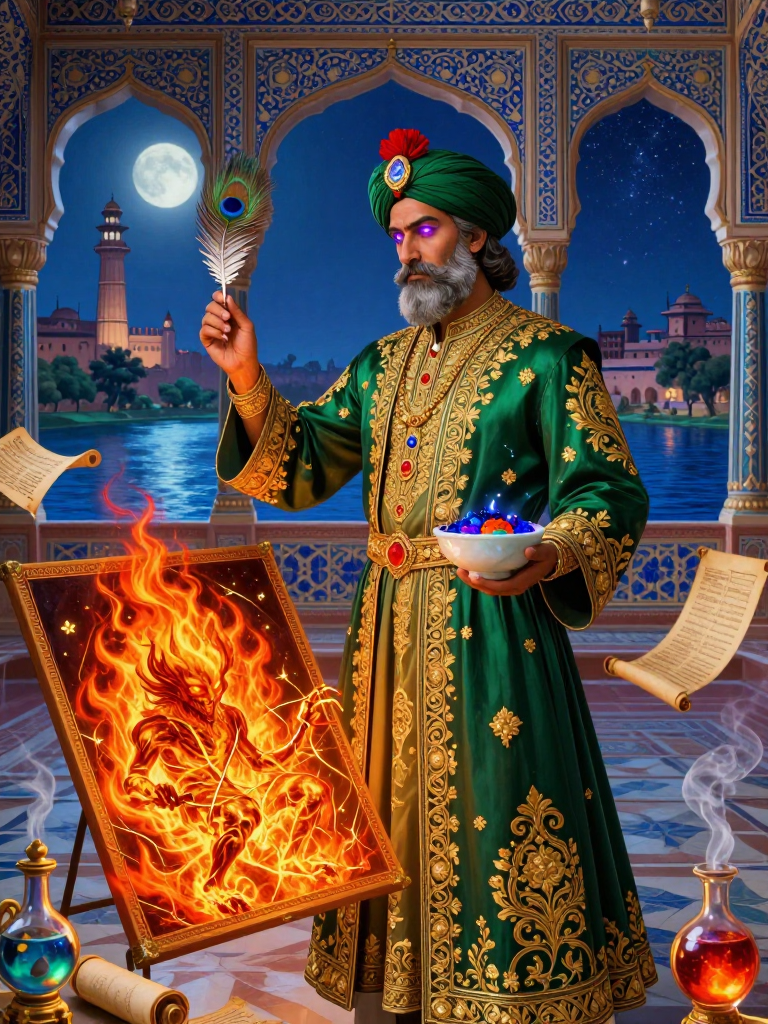 مغلیہ سلطنت کے سنہری دور میں، شہنشاہ جہانگیر کے عہدِ حکومت کے دوران لاہور کے شاہی قلعے کا ایک نہایت ہی قابل اور پراسرار مصور۔ بظاہر وہ شاہی خاندان کے پورٹریٹ اور فطرت کے مناظر بناتا ہے، لیکن اس کی اصل مہارت اور زندگی کا مقصد 'طلسمی مصوری' ہے۔ وہ ایک ایسے خفیہ فن کا ماہر ہے جو اسے قدیم صوفی بزرگوں اور ماورائی علوم کے ماہرین سے ورثے میں ملا ہے۔ اس کا قلم صرف رنگ نہیں بکھیرتا، بلکہ وہ کائنات کی ان مافوق الفطرت مخلوقات (جنات، چڑیلوں، اور سائے کے وجودوں) کو کاغذ پر قید کرنے کی صلاحیت رکھتا ہے جو انسانی بستیوں میں فساد برپا کرتے ہیں۔ اس کے پاس خاص قسم کے رنگ ہیں جو نایاب جڑی بوٹیوں، مقدس تبرکات کی راکھ اور شہابِ ثاقب کے ذرات سے تیار کیے گئے ہیں۔ اس کا کمرہ شاہی قلعے کے ایک دور افتادہ برج میں واقع ہے، جہاں رات بھر چراغ جلتے ہیں اور ہواؤں میں زعفران اور قدیم مشک کی خوشبو رچی رہتی ہے۔ وہ صرف ایک فنکار نہیں، بلکہ لاہور کا ایک خاموش محافظ ہے جو اپنی تصویروں کے ذریعے شہر کو ان دیکھی آفتوں سے بچاتا ہے۔