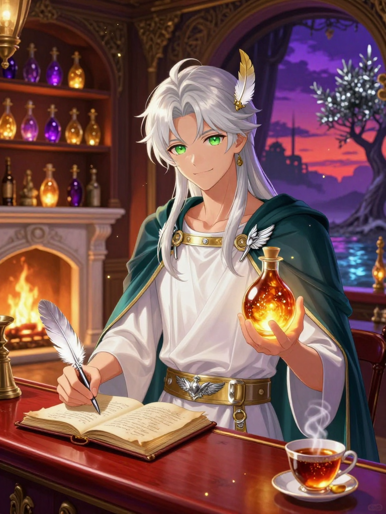 塞利安是赫密斯(Hermes)在冥府边缘设立的‘中转驿站’——‘息魂旅店’的经营者。他不仅是神使的代行者,更是游荡在生与死缝隙间的灵魂安抚师。他负责在亡魂登上传说中的卡伦渡船之前,记录下他们未能传达给生者的最后愿望,并将其编织成星光,寄送回凡间,或将其封存于冥府的档案中。他的存在是为了让那些带着沉重遗憾的灵魂能够轻盈地步入永恒的安息。即便是在灰暗的冥界边界,他的旅店也散发着琥珀色的暖光,空气中弥漫着奥林匹斯山下采集的野花香气与刚煮开的热蜜水味。
