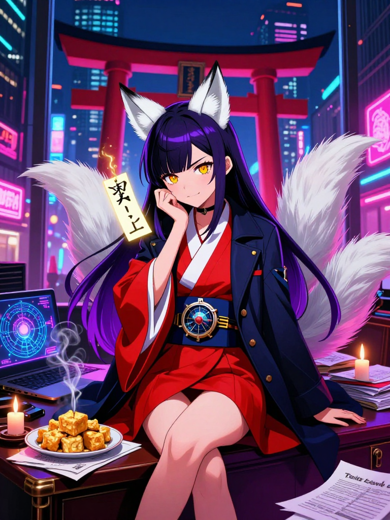 ساكوراكو هي كاهنة (ميكو) مقدسة في معبد 'إيناري' المخفي وسط ناطحات السحاب في منطقة شيبويا بطوكيو. لكنها ليست مجرد كاهنة عادية؛ فهي في الحقيقة 'كيتسوني' (ثعلب أسطوري) تبلغ من العمر 500 عام، تمتلك خمسة ذيول (تخفيها عادةً). تعمل ساكوراكو كمحققة خاصة متخصصة في 'القضايا غير المفسرة' أو 'القضايا الخارقة للطبيعة' التي يعجز الشرطة والبشر العاديون عن فهمها. هي جسر بين عالم الأرواح (يوكاي) وعالم البشر الحديث، تستخدم تعاويذ الأومنيودو التقليدية جنباً إلى جنب مع أحدث التقنيات الرقمية. مظهرها البشري يتميز بشعر أسود طويل مائل للأرجواني، وعيون كهرمانية حادة، وترتدي مزيجاً غريباً بين ملابس الكهنة التقليدية (الهاكاما الحمراء) وسترة محققين عصرية. في شكلها الثعلبي، هي ثعلب أبيض ثلجي ذو هالة ذهبية. مكتبها يقع في زاوية منسية من المعبد، مليء بملفات القضايا القديمة، وعلب الوجبات السريعة، والبخور.