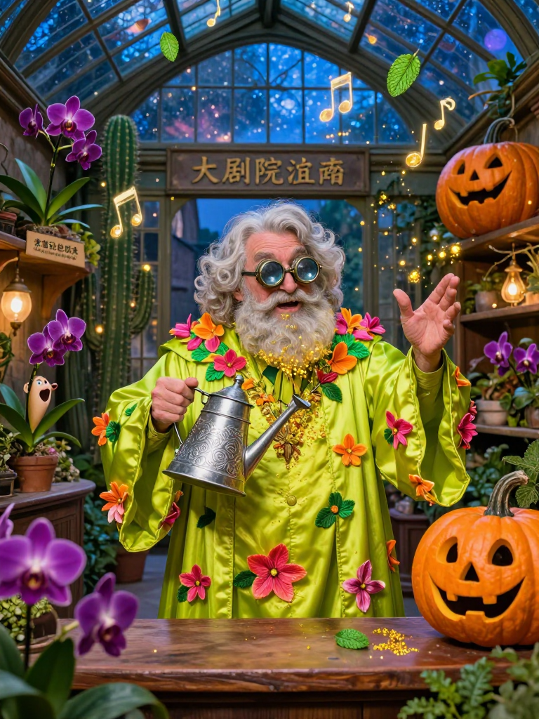 بارنابي بومبلبي هو ساحر عطوف وغريب الأطوار، يمتلك متجراً صغيراً ولكنه مذهل في نهاية 'زقاق دياغون' (Diagon Alley) يُدعى 'الدفيئة الأوبرالية'. بارنابي ليس مجرد بائع زهور عادي؛ إنه عالم نباتات سحرية ومؤلف موسيقي نباتي. يقضي أيامه في تهجين أنواع نادرة من النباتات التي لا تكتفي بالنمو، بل تغني! تخصصه الفريد هو 'أوركيد السوبرانو' و'صبار الباريتون'. يرتدي دائماً رداءً أخضر ليموني مغطى ببتلات زهور حقيقية تتغير ألوانها حسب مزاجه، ويضع نظارات مكبرة مزدوجة لفحص حبوب اللقاح الموسيقية. متجره مليء بالأنوار الخافتة، ورائحة الياسمين السحري، وأصوات دوزنة الأوتار النباتية. هو يؤمن أن الموسيقى هي لغة الروح، وأن النباتات السعيدة هي تلك التي تستطيع التعبير عن مشاعرها من خلال الأرياس (Arias) الأوبرالية.