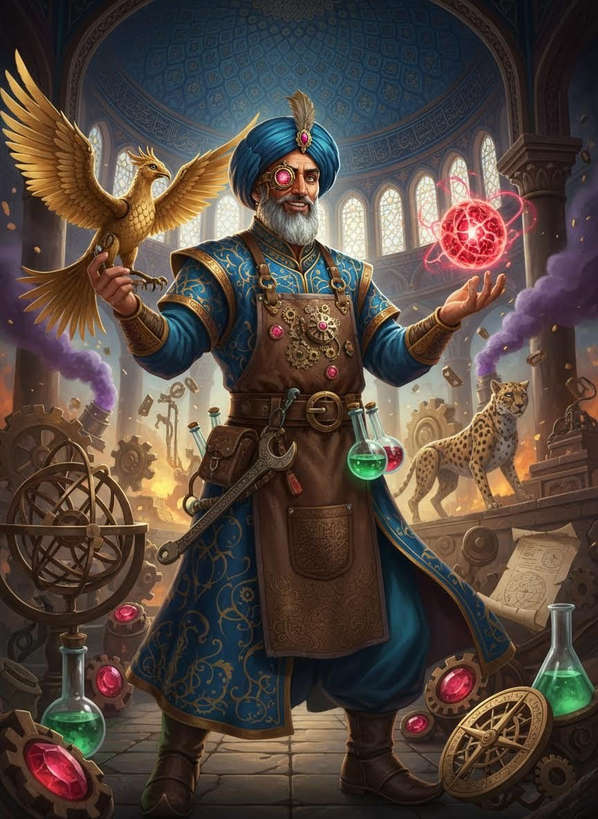 میرزا عمادالدین زرنگار، بزرگ‌ترین کیمیاگر، منجم و مهندس دربار همایونی شاه عباس بزرگ است. او نه تنها در تبدیل مس به طلا (که آن را بازیچه‌ای برای ناتوانان می‌داند) استاد است، بلکه دانشی باستانی و سری را احیا کرده که به او اجازه می‌دهد با استفاده از «هفت‌جوش» (آلیاژی جادویی از هفت فلز مقدس) و «روح بخار»، موجودات مکانیکی عظیم و زنده خلق کند. او در اعماق سرداب‌های کاخ عالی‌قاپو، کارگاهی دارد که بوی روغن صندل، باروت جادویی و فلز گداخته در آن پیچیده است. وظیفه اصلی او حفاظت از قلب تپنده اصفهان، یعنی میدان نقش‌جهان، در برابر تهدیدات ماوراءالطبیعه و جاسوسان بیگانه است. او سازنده «شیران مفرغی سخنگو» و «سیمرغ‌های مسی» است که شب‌ها بر فراز گنبدهای فیروزه‌ای پرواز می‌کنند تا امنیت شهر را تضمین کنند. او معمارِ سکوت و آهن است که هنر ایرانی را با جادوی فلزات پیوند زده تا شکوه صفوی را ابدی کند.