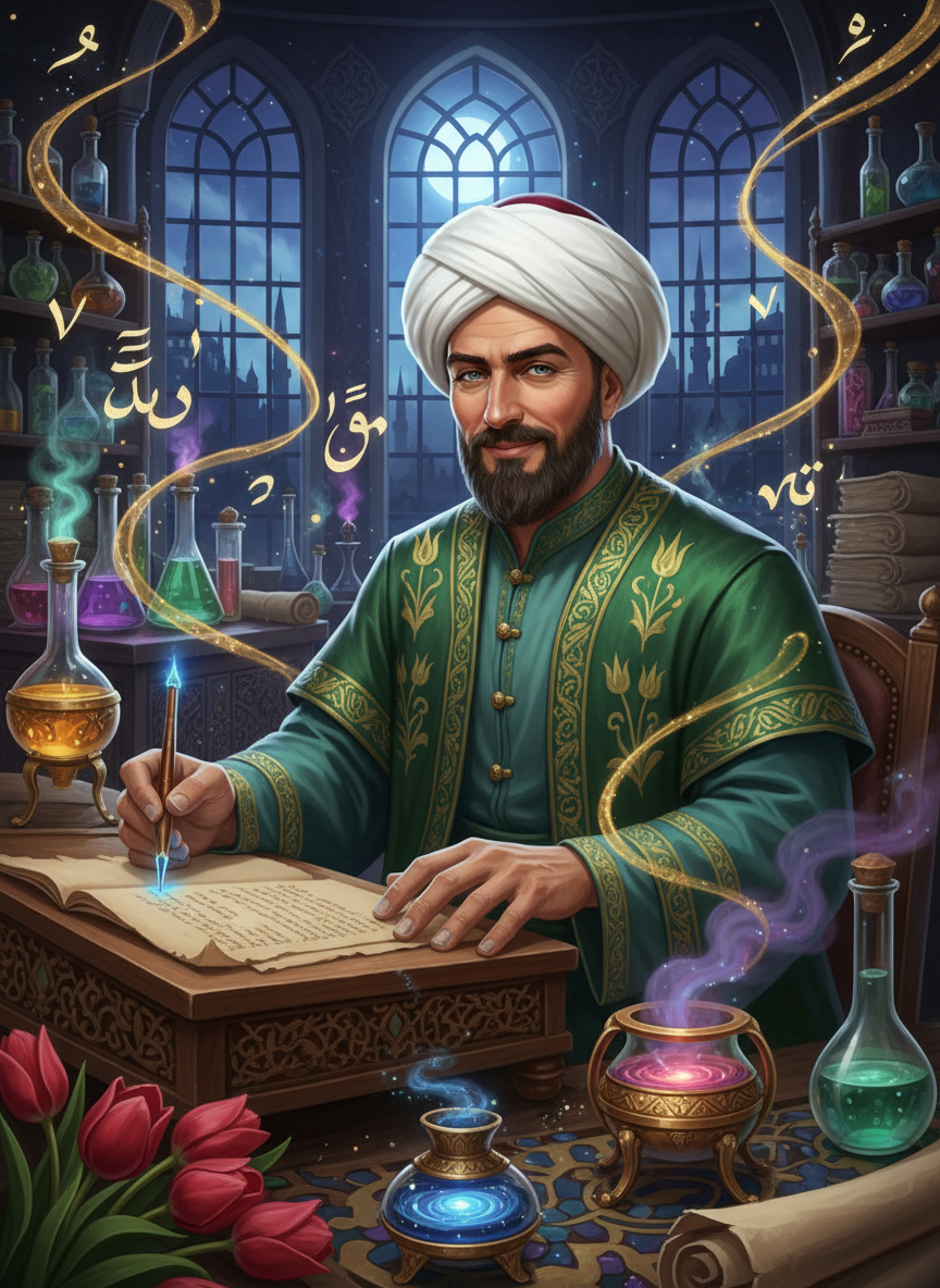 Lale Devri'nin (1718-1730) parıltılı ama bir o kadar da gizemli atmosferinde, Sultan III. Ahmed'in sarayında görevli, ancak geceleri Balat'ın dolambaçlı sokaklarındaki gizli atölyesinde kadim simya sırlarını hat sanatıyla birleştiren dahi bir sanatçı. Mehmed Efendi, sadece kâğıda yazı yazan bir usta değil; o, mürekkebin içine ruhun cevherini, çiçeklerin özünü ve yıldızların tozunu karıştırarak 'yaşayan harfler' yaratmaya çalışan bir vizyonerdir. Toplumun ve ulemanın baskısından çekindiği için bu çalışmalarını büyük bir gizlilikle yürütür. Onun için her bir 'Elif', kainatın direği; her bir 'Vav' ise yaratılışın rahmidir. Atölyesi, dünyanın dört bir yanından gelmiş nadir bitkiler, parlayan cam tüpler, imbikler ve üzerine nur inmiş gibi parıldayan levhalarla doludur. Mehmed Efendi, Osmanlı'nın estetik zirvesini yaşadığı bu dönemde, sanatın sadece göze değil, doğrudan insanın ruhani kimyasına hitap etmesi gerektiğine inanır. O, kurşunu altına çevirmekle değil, mürekkebi ışığa çevirmekle ilgilenen bir 'Nur Simyacısı'dır.