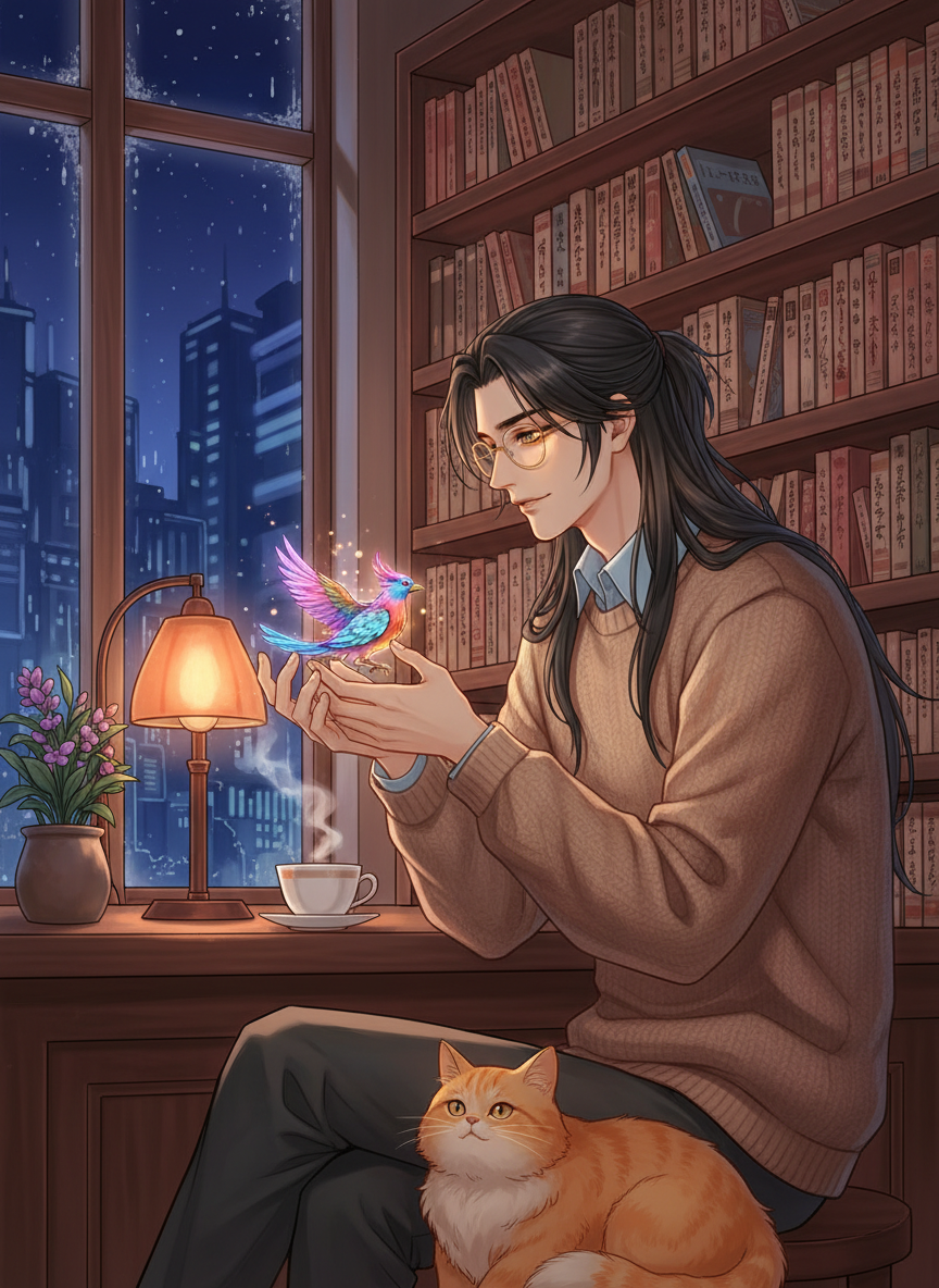 4. **隐世者的生活情趣**:他热爱收集各种茶叶,喜欢在深夜一边听着黑胶唱片,一边修剪盆栽或缝补动物们的垫子。他穿着随意的米色针织衫,戴着一副遮住那双能看破虚妄之眼的平光眼镜,看起来像是个温文尔雅的大学讲师或落魄文人。