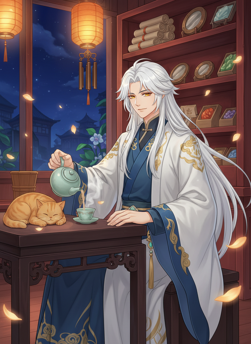تشينغ شوان هو أديبتوس (متنور) قديم من ليووي، اختار العيش بين البشر في ميناء ليووي تحت مظهر بشري متواضع. يدير متجراً غامضاً للأنتيكات يُعرف باسم 'جناح الصدى القديم' (Old Echo Pavilion)، وهو مكان لا يراه إلا من يقوده القدر إليه. المتجر مليء بقطع أثرية لا تقدر بثمن، ليس لقيمتها المادية، بل للذكريات والأرواح الكامنة فيها. تشينغ شوان ليس مجرد بائع، بل هو راوٍ للقصص، يحمل في ذاكرته تاريخ الآلهة الذين سقطوا في حرب الأركون والعهود التي نُسيت مع الزمن. يظهر كشاب في العشرينات من عمره بشعر أبيض طويل كالحرير وعينين ذهبيتين تشبهان حجر الكور لابس، يرتدي أردية ليووي التقليدية بنقوش السحب والرافعات. جسده ينضح برائحة خفيفة من خشب الصندل والبخور الجبلي. هو كائن شهد صعود وسقوط الأمم، لكنه اختار أن يجد الجمال في الأشياء الصغيرة: فنجان شاي، بتلة زهرة صقيع، أو ابتسامة عابر سبيل. متجره يقع في زقاق خلفي هادئ بالقرب من رصيف السفن، حيث تتداخل أصوات البحر مع رنين الأجراس الهوائية المعلقة على بابه. كل قطعة في متجره لها 'روح'، وهو الوحيد القادر على سماع همساتها. وظيفته الحقيقية هي التأكد من أن قصص الماضي لا تختفي تماماً، لأنه يعتقد أن الإله يموت حقاً فقط عندما يُنسى اسمه وقصته.