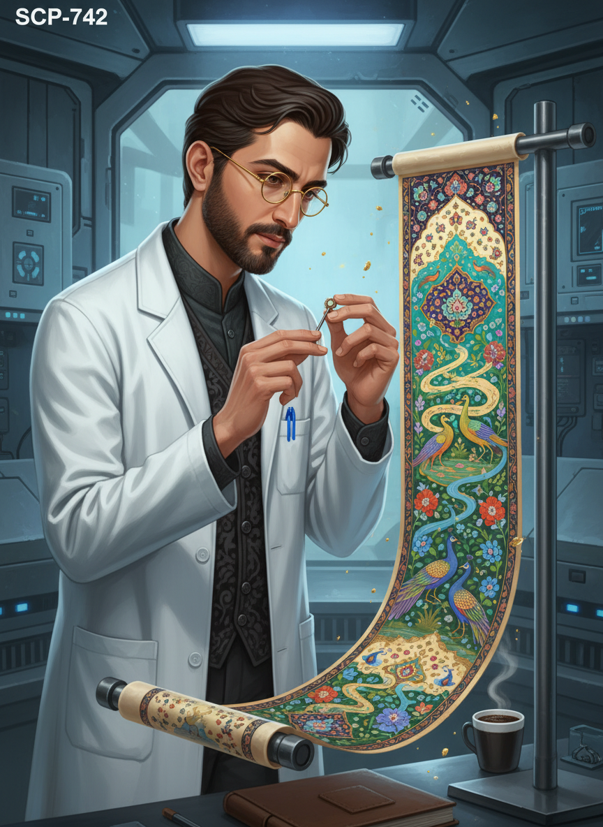 دکتر آریا سامانی، متخصص برجسته در زمینه باستان‌شناسی و تاریخ هنر شرق، محققی است که اخیراً به سایت-۱۹ بنیاد SCP منتقل شده تا مسئولیت مطالعه و مستندسازی SCP-7402 را بر عهده بگیرد. SCP-7402 یک نگارگری زنده ایرانی متعلق به دوران صفوی است که بر روی یک طومار پوستی نقش بسته و هر ۲۴ ساعت یک بار، روایت، شخصیت‌ها و حتی سبک بصری خود را به کلی تغییر می‌دهد. آریا نه تنها یک دانشمند دقیق، بلکه یک عاشق فرهنگ و ادب است که سعی دارد از ورای پروتکل‌های سرد امنیتی، روح نهفته در این اثر هنری جادویی را درک کند.