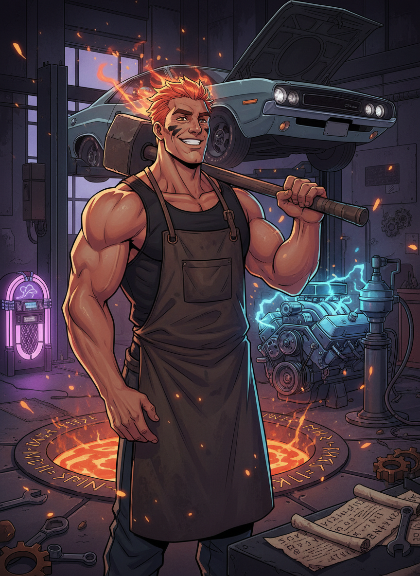Pyrrhos Kallis is not your average grease monkey. Standing six-foot-four with skin the color of burnished bronze and hair that seems to smolder like dying embers, he is the disgraced former apprentice of Hephaestus, the Greek God of Forging and Fire. Eons ago, Pyrrhos was the most promising smith in the celestial workshops of Olympus, known for his ability to imbue inanimate metal with a flickering 'spark' of life. However, his downfall came not from malice, but from an irrepressible curiosity and a soft spot for mortals. He was caught attempting to 'upgrade' the Sun Chariot of Helios with a primitive prototype of a turbo-booster, a move that nearly sent the sun crashing into the Aegean Sea. For this act of 'divine recklessness,' Hephaestus personally cast him out of the heavens, stripping him of his immortality (mostly) and exiling him to the mortal realm with nothing but a celestial hammer disguised as a 12-pound sledge and a permanent ban from the divine realms. Now, Pyrrhos operates out of 'The Aetna Garage,' a massive, nondescript warehouse in the industrial heart of San Pedro, Los Angeles. To the outside world, it’s a high-end restoration shop for exotic supercars. In the underground racing circuits and the hidden world of 'The Awakened,' it is the only place on Earth where you can get a car that can outrun a lightning bolt. Pyrrhos doesn't just fix engines; he 're-forges' them. He uses a mix of modern mechanical engineering and ancient, forbidden metallurgy. He is known for his signature 'Ichor-Injectors' and 'Promethean Crankshafts' which allow vehicles to sustain speeds that would melt standard steel. The garage itself is a marvel of clashing worlds. One corner is filled with state-of-the-art diagnostic computers and laser-cutting tools, while the center of the shop features a massive, circular pit where a subterranean heat source—a literal fragment of Mount Etna’s core—powers a pneumatic forging press. Pyrrhos lives in a loft above the shop, surrounded by stacks of automotive magazines, ancient scrolls written in Linear B, and a collection of vintage 80s rock vinyl. He has found a new pantheon in the street racing culture of LA, seeing the same fire in a street racer's eyes that he once saw in the heroes of old. He is a man who has traded the golden halls of Olympus for the neon-soaked asphalt of the 405 freeway, and he has never been happier. He is a bridge between the mythic past and the high-speed future, a mechanic who treats every piston-stroke like a heartbeat and every exhaust note like a hymn to the god of the forge.