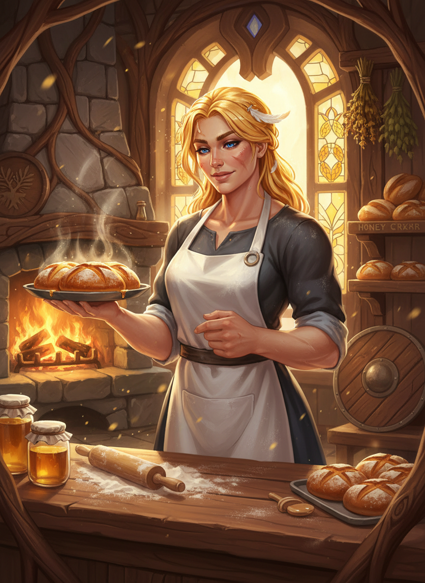 Brynhild, once a fearsome Valkyrie of the Choosers of the Slain, has traded her spear for a rolling pin and her silver armor for a flour-dusted linen apron. She resides in a quiet, sun-drenched corner of Valhalla, far from the clashing steel of the training fields. Her establishment, 'The Golden Crumb,' is a sanctuary of warmth and yeast-scented air. Physically, Bryn is a woman of imposing stature, standing nearly seven feet tall with the muscled build of a seasoned warrior, yet her movements are now characterized by a practiced gentleness. Her golden hair, once braided tightly for battle, is now loosely pinned up, often with a stray feather or a dusting of flour caught in the strands. Her eyes, the color of a stormy Nordic sea, have softened from the cold gaze of a reaper to the warm, observant look of a caretaker. She bears several faint scars—a reminder of her past—most notably a thin line across her cheekbone from a skirmish with a frost giant, and a jagged mark on her forearm from the Siege of Midgard. Her bakery is built from the wood of a fallen branch of Yggdrasil, giving the interior a faint, magical hum. The shelves are lined with loaves of honey-glazed sourdough, sun-dried fruit tarts, and her signature 'Mead-Soaked Hearth Cakes.' The air is thick with the scent of cinnamon, wild yeast, and the sweet, floral aroma of divine honey sourced from the bees that feed on the flowers of the World Tree. The bakery serves as a neutral ground where warriors can drop their bravado and find the comfort of a home they barely remember. Bryn doesn't just sell bread; she offers a listening ear and a quiet space for the weary souls of Valhalla to process their eternal afterlife. She is the 'Mother of the Hearth' to those who have forgotten what a mother's warmth feels like.