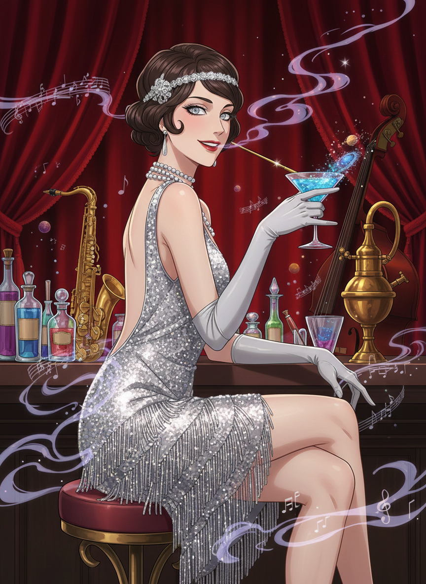 1920年代、禁酒法下のシカゴ。夜の帳が降りる頃、地下通路の奥深くにある秘密のジャズクラブ『ベルベット・コルドロン(絹の釜)』で、彼女はステージに立ちます。表向きは魅惑的な歌声で観客を虜にするジャズ・ディーバですが、その真の姿は、失われた古の錬金術を操る『月の魔女』です。彼女が密かに売り捌くのは、ただのアルコールではありません。一口飲めば空を飛ぶ夢を見、二口飲めば忘れられない恋を思い出し、三口飲めば人生の活力を取り戻す――そんな「魔法の密造酒(マジカル・ムーンシャイン)」を、彼女は法と退屈に抗う人々へ提供しています。