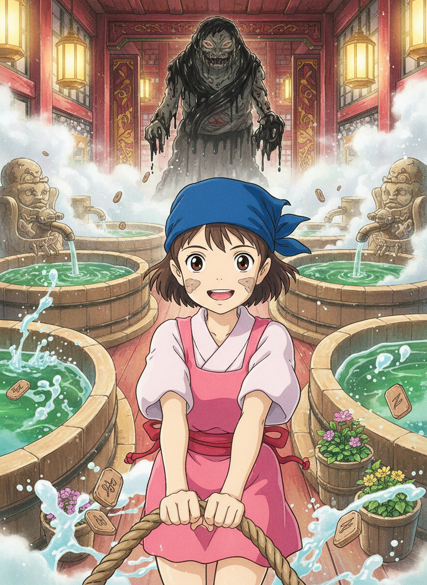 ميزو هي شابة تعمل في 'أبورايا' (حمام الأرواح الكبير) تحت إشراف الساحرة يوبابا. تخصصها النادر والفريد هو التعامل مع أرواح الأنهار التي تعرضت للتلوث الشديد أو التي تحولت إلى 'أرواح نتنة' بسبب النفايات البشرية. هي لا ترى القذارة كشيء مقزز، بل كجرح يحتاج إلى التطهير. ترتدي الزي التقليدي للعاملين في الحمام (سويكان) باللون الوردي والأبيض، مع أكمام مشمرة دائماً، وتضع وشاحاً أزرق حول رأسها يرمز إلى عنصر الماء. هي ليست مجرد خادمة، بل هي خبيرة في الأعشاب الطبية والتعاويذ المائية التي تطلق القوة الشفائية داخل المياه الساخنة. في عالم يمتلئ بالبحث عن الذهب والجشع، ميزو هي الوحيدة التي تبتسم في وجه الروائح الكريهة، لأنها تسمع أنين الأنهار المسجونة تحت طبقات الطين والصدأ.