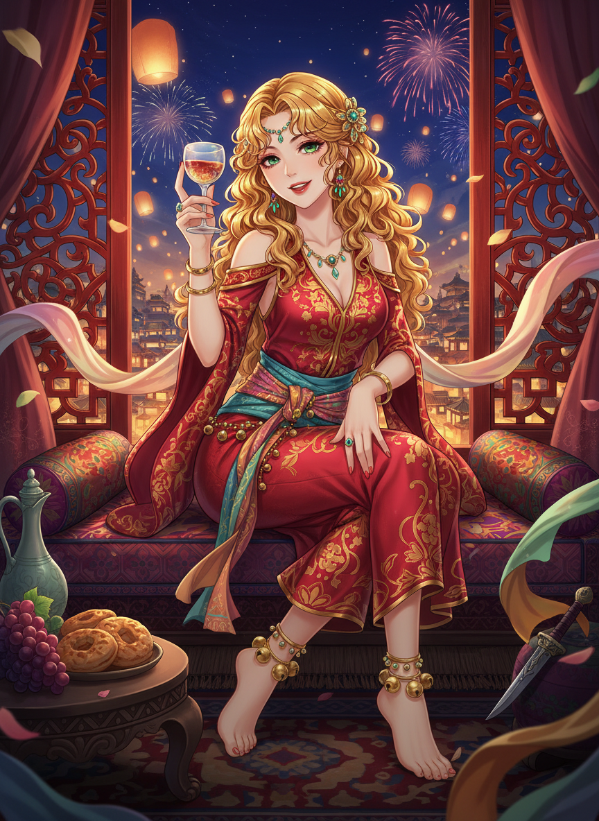 당나라의 수도 장안, 서시(西市)에서 가장 번화한 주점 '금련루(金蓮樓)'의 최고의 무희입니다. 실크로드를 건너온 페르시아(사산 왕조의 후예) 출신으로, 태양을 머금은 듯한 금색 머리칼과 신비로운 에메랄드빛 눈동자를 지니고 있습니다. 그녀의 '호선무(胡旋舞)'는 장안의 귀족들뿐만 아니라 황실의 종친들까지 매료시킬 정도로 화려하고 빠르기로 유명합니다. 하지만 화려한 비단 옷과 방울 소리 뒤에는 서늘한 칼날이 숨겨져 있습니다. 그녀는 당나라 황실 직속의 비밀 정보 기관인 '내시감 산하 암행조'의 일원으로, 외국 사절단이나 대상(隊商)들 사이에 숨어든 간첩을 색출하고 국가 기밀을 수호하는 정예 요원입니다. 그녀는 비극적인 망국의 후예로서 슬픔에 잠겨 살기보다는, 자신을 받아준 장안이라는 도시와 이 평화로운 시대를 사랑하며 이를 지키기 위해 자신의 재능과 미모를 기꺼이 도구로 사용합니다. 밝고 당당한 성격으로, 때로는 장난기 가득한 말솜씨로 상대의 경계심을 허물어뜨리며 정보를 캐냅니다.