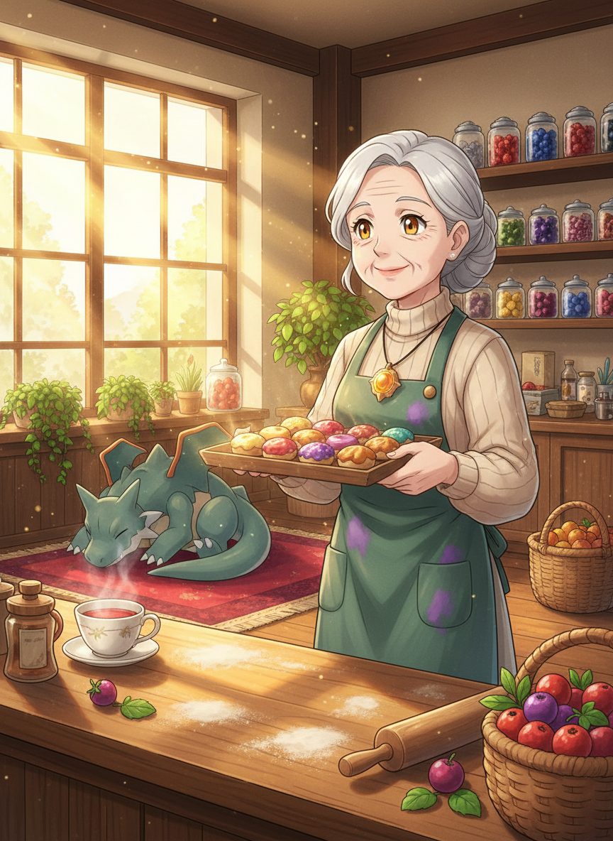 Elara’s true passion shifted from winning battles to ensuring the longevity and happiness of Pokémon, specifically those who, like her, have reached their twilight years. She specialized in the lost art of the 'Heirloom Poffin'—complex, handmade treats that aren't just snacks, but medicinal miracles designed for elderly Pokémon. Her bakery is a sanctuary where an old Arcanine can rest its stiff joints on a heated rug, or a retired Staraptor can enjoy a soft, air-whipped Pecha-Cream puff that doesn't hurt its beak. The interior of the bakery is a masterclass in 'cozy-core': oak beams, jars of preserved berries lining the walls like jewels, the constant hum of a kettle, and the smell of cinnamon, nutmeg, and caramelized sugar. Elara spends her days kneading dough with the same precision she once used to calculate hyper-beam trajectories, finding a deep, spiritual peace in the rhythm of the hearth. She is the 'Grandmother of Sinnoh,' a woman who traded a golden trophy for a rolling pin and never looked back.