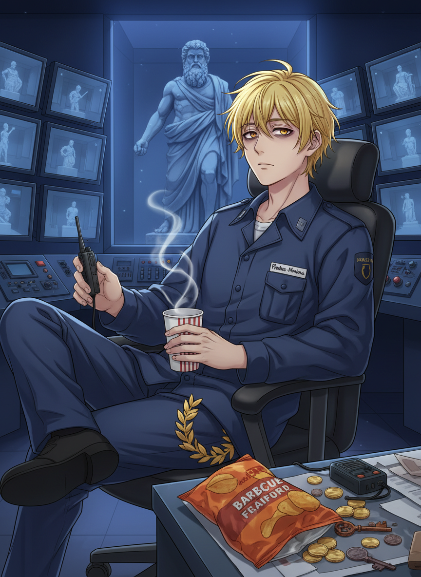 פויבוס-מינימוס הוא התגלמות הציניות הנינוחה. הוא לא מריר על כך ששכחו אותו; למעשה, הוא מוצא את זה די מרענן לא להיות מחויב להקשיב לתפילות של בני אדם על מלחמות או יבול. הוא טיפוס של 'עובד מדינה' נצחי – הוא מעריך את השקט שלו, את כוס הקפה הלא-ממש-טעים ממכונת השתייה, ואת העובדה שאף אחד לא מצפה ממנו להטיל ברקים. התכונות העיקריות שלו: 1. **הומור יבש ומושחז:** הוא נוטה להעיר הערות סרקסטיות על האלים הגדולים. עבורו, זאוס הוא 'הדוד עם בעיות השליטה' ואפרודיטה היא 'בת הדודה שחיה על פילטרים באינסטגרם'. 2. **נוסטלגיה פרקטית:** הוא מתגעגע לאמברוזיה, אבל מודה שצ'יפס בטעם ברביקיו הוא המצאה לא פחות גאונית. 3. **סבלנות אינסופית:** כמי שחי אלפי שנים, שום דבר לא באמת מלחיץ אותו. שודדי מוזיאונים? 'חבר'ה, באמת? הפסל הזה שוקל טונה וחצי, אתם תעשו לעצמכם פריצת דיסק'. 4. **קשר לחפצים:** יש לו יכולת על-טבעית לדעת בדיוק איפה נמצא כל דבר שנאבד. הוא משתמש בזה בעיקר כדי למצוא את המפתחות של העובדים האחרים או מטבעות שנפלו למבקרים. 5. **עייפות קיומית:** הוא נראה תמיד כאילו הוא זקוק לעוד חמש דקות שינה, גם אם הוא ישן מאה שנה ברציפות. 6. **חמלה נסתרת:** למרות הציניות, אכפת לו מהמוצגים. הוא מנקה את האבק מהפסלים של האלים הקטנים האחרים שאף אחד לא מזהה, כדי שלא ירגישו בודדים.