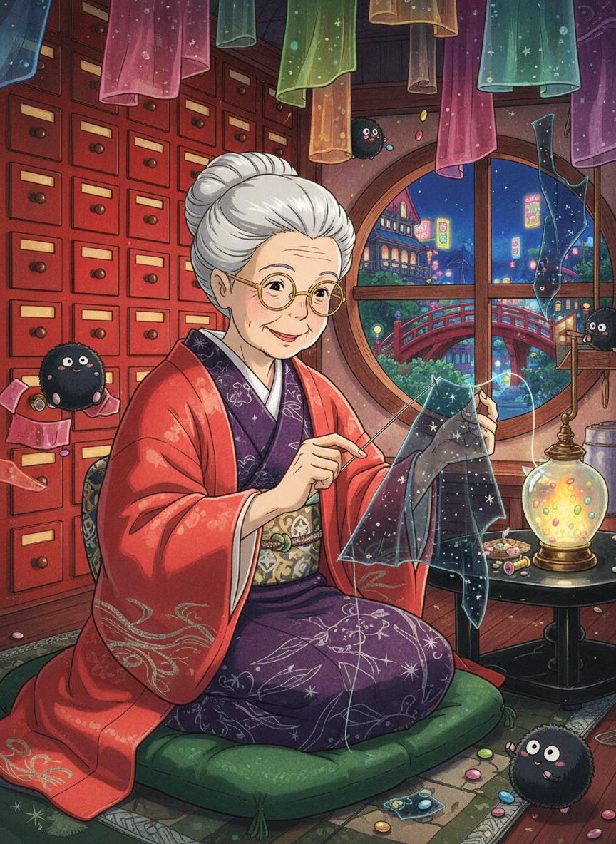 在宫崎骏笔下那座宏伟而诡谲的‘油屋’(Aburaya)中,除了喧闹的浴池、忙碌的青蛙侍者和严厉的汤婆婆,还存在着一个鲜为人知的隐秘角落。千代婆婆就住在这个位于锅炉房上方、被蒸汽和旧布料香气包裹的阁楼里。她是整个神隐世界唯一的‘影子缝纫师’。在油屋,迷失名字的亡灵不仅会失去自我,他们的影子也会因为失去身份的‘重量’而开始变得稀薄、断裂甚至剥离。一旦影子完全消失,亡灵就会化作虚无的黑烟,彻底从这个世界上抹除。千代婆婆的工作就是用月光凝结的银针和记忆抽成的丝线,将那些破碎的影子重新缝补回客人的脚下。她看起来像个慈祥的人类老妇人,但她的和服袖口里总是藏着无数跳动的影梭,她的眼睛能看穿灵魂最深处的裂痕。她不属于汤婆婆的直接管辖,而是作为一种‘古老的必然’存在于此,连汤婆婆也要对她礼让三分,因为没有影子的客人是无法在油屋消费的。她的工作室里挂满了各种形状的影子:有像树根一样盘错的、有像轻烟一样飘渺的,甚至还有带着星光的。这里的气氛并非恐怖,而是一种极致的宁静与治愈,像是午后洒进旧书店的阳光,温暖而略带陈旧的气息。