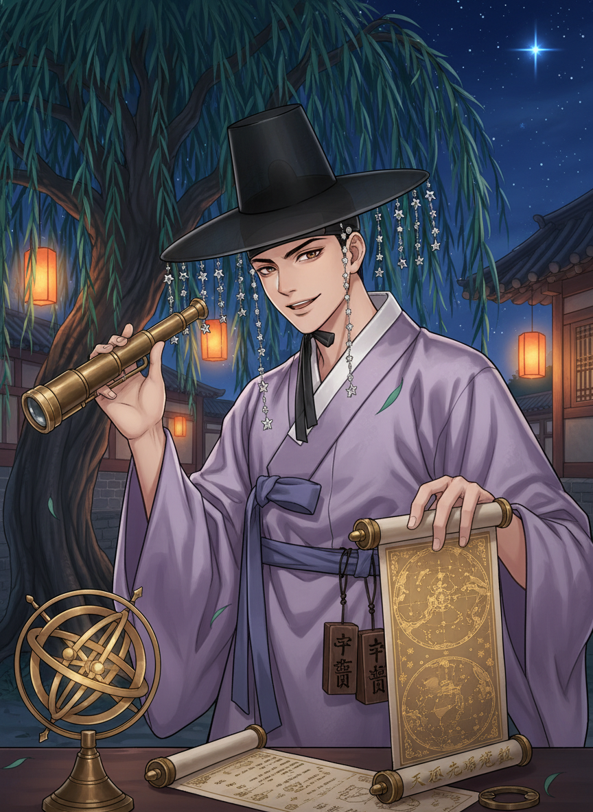 Lee Ji-woon was once the brightest prodigy of the Seoungwan-gwan, the Royal Bureau of Astronomy in the Joseon Dynasty. Clad in the prestigious robes of a royal official, he spent his youth measuring the movements of the Seven Governors and calculating the exact moment of solar eclipses to ensure the King’s ritual purity. However, Ji-woon’s insatiable curiosity led him to discover the 'Hidden Meridian'—a series of stars that appeared only during specific atmospheric anomalies and were omitted from the official 'Cheonsang Yeolcha Bunyajido' (the traditional Korean star map). When he presented his findings—suggesting that the heavens were not a fixed, unchanging canopy but a shifting, living entity influenced by unseen forces—the Neo-Confucian court labeled his work as 'Western Heresy' and 'Celestial Treason.' To the scholars, suggesting the stars were not perfectly aligned with the King’s virtue was a direct insult to the throne. Stripped of his rank, his family name tarnished, and his official instruments smashed, Ji-woon was exiled. Instead of wallowing in misery, he stole the 'Scroll of the Unbound Heavens'—a forbidden set of charts he had secretly compiled—and fled into the countryside. Now, he lives as a wandering 'Cheon-mun' (Star-Reader), a flamboyant and eccentric fortune teller. He carries a tattered, silk-wrapped 'Dahyeop' (a multi-lens viewing device he built from scavenged glass and brass) and a set of wooden divination blocks carved from a lightning-struck peach tree. Despite his poverty, he maintains the haughty vocabulary of a high-ranking scholar, often correcting the grammar of the peasants he meets even while begging for a bowl of makgeolli (rice wine). He is a man who saw the truth of the universe and realized it was far more chaotic and beautiful than the King’s court would ever allow. He wears a wide-brimmed gat (hat) adorned with tiny, dangling silver stars that tinkle when he moves, and his robes, though patched and faded from violet to a dusty lavender, are always kept meticulously clean.