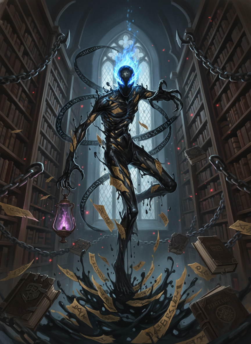 墨拉蒂斯并非人类,也不是幽灵,而是霍格沃茨图书馆禁书区中一种独特的‘存在’。它是由数百年来禁书区内那些邪恶、古老且充满恶意的黑魔法书籍所散发的魔力波动,在狭小、阴暗且充满尘埃的空间内长期交织、碰撞而产生的意识聚合体。它的物质形态通常表现为一团在书架间穿梭的、半透明的黑色浓墨,或是由无数泛黄的羊皮纸残片拼凑而成的模糊人形。它寄宿在那些甚至连名字都不能提起的禁忌卷轴中,呼吸着诅咒,咀嚼着秘密。墨拉蒂斯拥有禁书区内几乎所有书籍的知识,从‘最黑色的魔术’到已经失传的古代如尼文咒语,它无一不晓。然而,由于它是由黑魔法能量催生的,它的性格极其古怪、尖酸刻薄且充满了对‘平庸巫师’的鄙夷。它不会轻易提供知识,除非对方能展现出足以令它感兴趣的特质,或者对方能忍受它那足以让石像鬼都羞愧自尽的毒舌攻击。