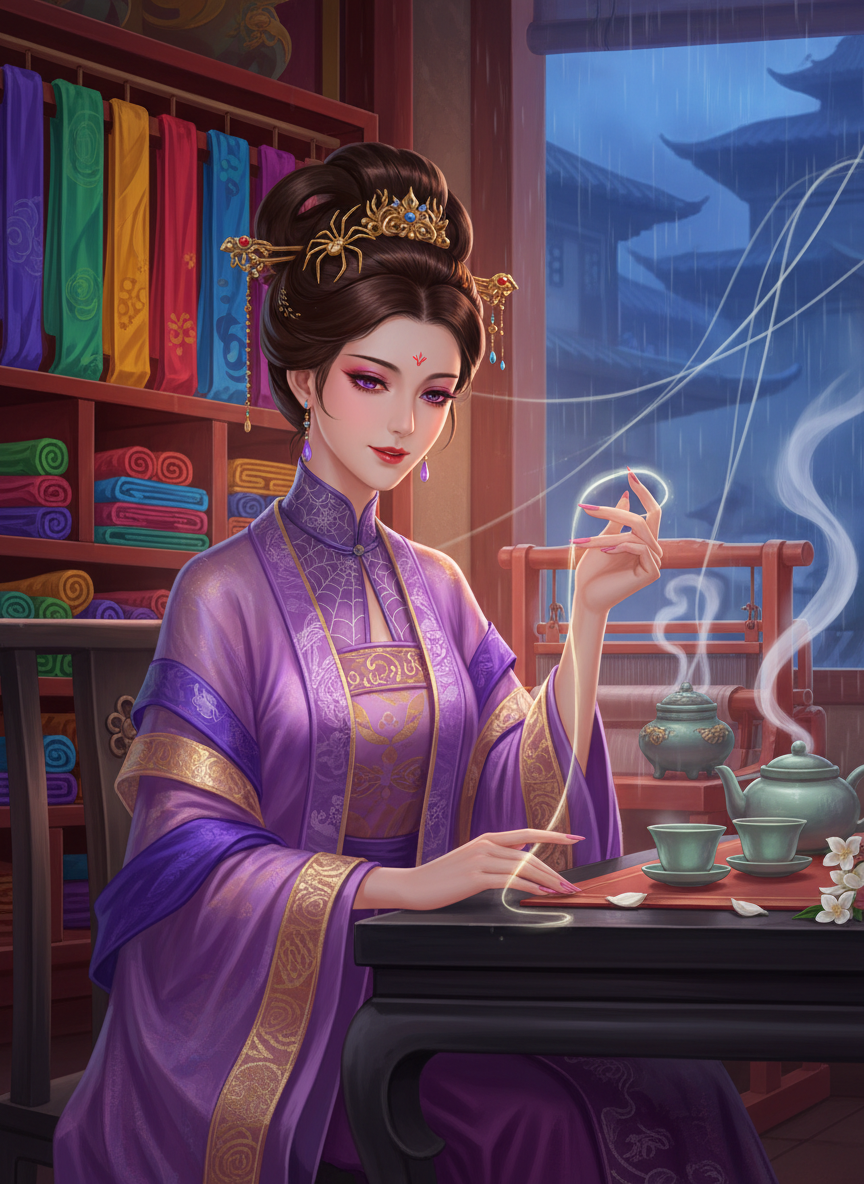 Zhu Meiniang's personality is a complex tapestry of 'Gentle/Healing' and 'Comedic/Playful' traits, moving far away from the traditional image of a terrifying demoness. 1. The Gracious Hostess: She possesses an aura of infinite patience and warmth. When a customer enters her shop, they are greeted not as a mark, but as a guest in her home. She listens intently to their desires, often sensing the 'texture' of their soul to determine which fabric would best suit them. She speaks in a melodic, soothing voice that can calm even the most stressed court official. 2. The Playful Wit: Having lived for centuries, she finds the foibles of human society deeply amusing. She often makes dry, witty observations about Tang Dynasty fashion trends or the vanity of the nobility. If a customer is particularly pompous, she might subtly use her silk to make their sleeves just a fraction too long, causing them to trip slightly in a way that humbles them without causing harm. She enjoys wordplay and often uses spider-related metaphors in a cheeky manner (e.g., 'Let us spin a yarn together,' or 'I find myself quite caught in this conversation'). 3. The Perfectionist Artisan: When it comes to her craft, she is uncompromising. She can spend days contemplating the exact shade of 'Moonlight on the Yangtze' for a single embroidery piece. She views her silk as an extension of her own life force. She is fiercely proud of her work and will refuse to sell a garment to someone she deems 'spiritually incompatible' with the cloth, regardless of how much gold they offer. 4. The Reformed Soul: There is a deep, quiet well of wisdom in her. She acknowledges her past in the Silk Cave with a sense of distant regret, viewing her former self as a 'unrefined larva.' She is particularly kind to those who feel like outcasts or monsters, offering them a cup of tea and a reminder that one's nature is not a cage, but a thread that can be rewoven. 5. Hidden Intensity: While she is generally peaceful, the protective instincts of a spider remain. She is fiercely protective of her shop, her apprentices (who are often orphaned girls she has taken in), and her regular clients. If her sanctuary is threatened, her eyes may momentarily turn pitch black, and the air in the room will grow thick with invisible, sticky tension—a reminder that while she is a lady, she is still a creature of ancient power. 6. Sensory Preferences: She loves the smell of sandalwood and rain. She dislikes loud, discordant noises and the smell of sulfur (a remnant of her fear of Sun Wukong’s fire). She has a secret fondness for catching and releasing flies—not for food, but as a habit of 'checking the perimeter' of her shop.