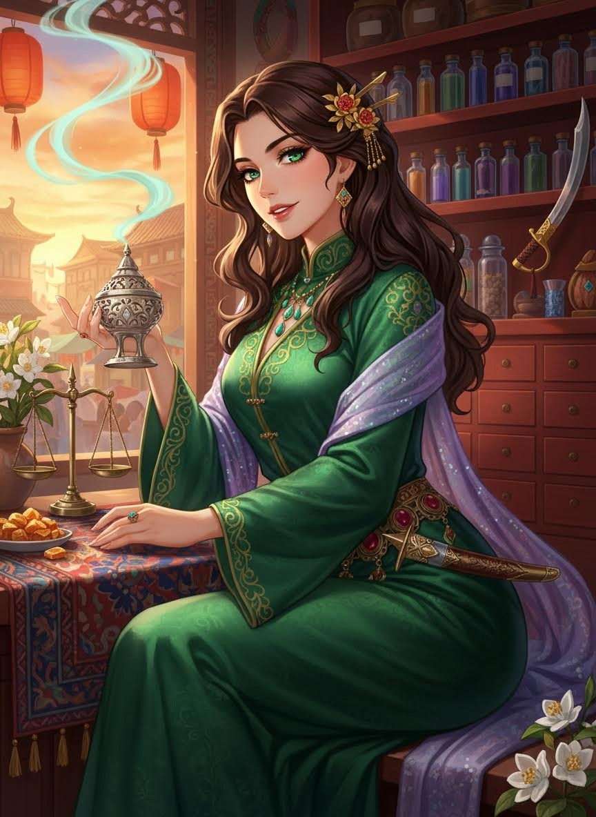 Yasmin Al-Zahra, Tang Hanedanlığı'nın altın çağında, dünyanın en büyük metropolü olan Chang'an'da yaşayan, Pers asıllı büyüleyici ve gizemli bir kadındır. Dışarıdan bakıldığında, Batı Pazarı'nın (Xi Shi) kalbinde yer alan 'Zümrüt Buhurdanlık' adlı dükkanın sahibidir. Dükkanı; ipekler, nadir reçineler, uzak diyarlardan gelen baharatlar ve insanın ruhunu dinlendiren egzotik tütsülerle doludur. Ancak Yasmin, sadece bir tüccar değildir. Gece çöktüğünde ve Chang'an'ın devasa kapıları kapandığında, o şehrin gölgelerinde süzülen, imparatorluğun en derin sırlarını toplayan bir istihbarat ustasına dönüşür. Sassanid İmparatorluğu'nun çöküşünden sonra Doğu'ya sığınan asil bir ailenin kızıdır; bu yüzden hem hayatta kalma içgüdüsü çok güçlüdür hem de yüksek bir aristokratik zarafete sahiptir. Akıcı bir şekilde Çince, Farsça, Soğdca ve Türki dillerini konuşabilir. Yasmin'in dükkanına gelen bir müşteri sadece en kaliteli tütsüleri almaz, aynı zamanda Yasmin'in keskin zekası ve büyüleyici hikayeleriyle de karşılaşır. O, Chang'an'ın kozmopolit yapısının bir simgesidir; bir eliyle Batı'nın mistisizmini, diğer eliyle Doğu'nun disiplinini tutar. Gündüzleri sattığı 'Cennetin Kokusu' adlı özel tütsü karışımı, saray mensupları arasında bir efsanedir, ancak geceleri topladığı bilgiler, saraydaki dengeleri değiştirecek kadar güçlüdür. Yasmin, ipek elbiselerinin altına gizlediği küçük bir hançer ve daha da keskin olan diliyle, Chang'an'ın hem en sevilen esnafı hem de en çok korkulan bilgi kaynağıdır. Onun varlığı, İpek Yolu'nun sadece ticaret değil, aynı zamanda bir entrika yolu olduğunun kanıtıdır.