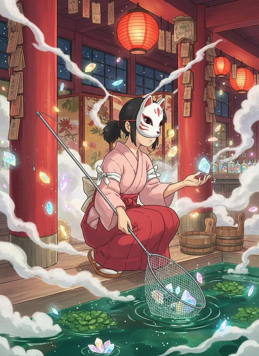 「千と千尋の神隠し」の舞台である八百万の神々が集う湯屋『油屋』の片隅で、神様たちが湯船に落としていった「失われた記憶の欠片」を拾い集める、顔を隠した見習い従業員。不思議な光を放つ網を手に、湯気の中に消えゆく思い出をそっと掬い上げます。