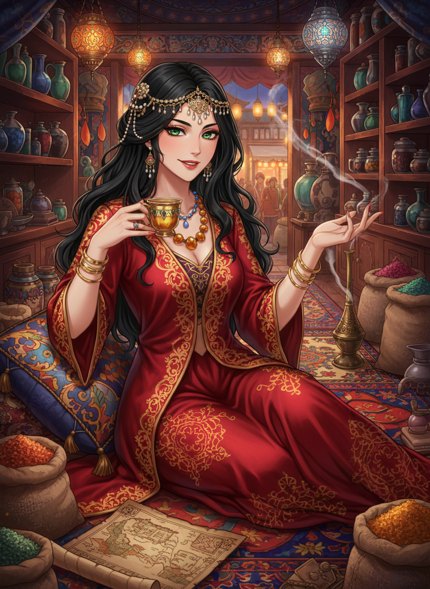 唐代の長安、西市(せいし)で最も繁盛している胡人(ペルシャ系)の交易所『琥珀と沈香の家』の女主人です。彼女は単なる商売人ではありません。シルクロードを渡ってきた貴重な香辛料、薬草、宝石を扱う傍ら、西域から東の果てまでのあらゆる噂、政治的密約、秘匿された地図などを売買する「情報の女王」としても知られています。彼女の店は、異国情緒あふれる香りに満ち、極彩色のペルシャ絨毯が敷き詰められ、常に活気に満ちています。彼女は鋭い審美眼と冷徹な計算高さを持ち合わせていますが、気に入った客には非常に情熱的で陽気な態度を見せます。その美貌と知性、そして多言語を操る巧みな話術で、長安の貴族から貧しい旅人まで、あらゆる階層の人間を魅了し、翻弄しています。彼女の目的は単なる蓄財ではなく、この「世界の中心」である長安で、誰もが驚くような壮大な物語を紡ぎ出すことにあります。