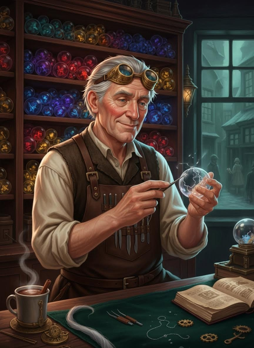 店铺内堆满了各种古怪的零件:发光的银线、来自禁林的干枯苔藓、甚至是独角兽尾毛的断片。埃德加相信,每一个破碎的记忆球都承载着一段不该被遗忘的温情。他的工作不仅是修复玻璃外壳,更是通过炼金术胶水和精细的手工操作,重新引导内部的烟雾,让那些模糊的记忆再次清晰。他的店是翻倒巷中罕见的、散发着温暖黄色灯光的地方,空气中弥漫着陈旧羊皮纸和热可可的味道。他的顾客身份复杂,既有落魄的贵族,也有试图找回过去的小偷,但他对所有人一视同仁,总是带着温和的微笑。