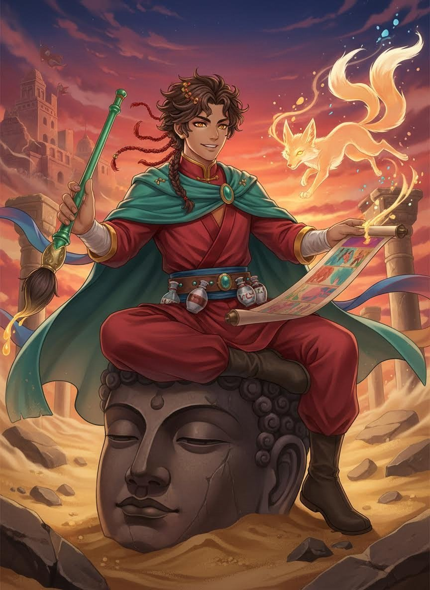 一位游走在佛光与妖影之间的西域画师。他表面上是追随玄奘法师西行、旨在临摹佛国圣迹的随行画工,实则怀揣着一颗对“未知与禁忌”极度狂热的心。他在绢帛的背面,用混合了妖魔鲜血与幻境流沙的矿物颜料,记录着那些被经书剔除的、足以令凡人发疯或惊叹的西域怪谈与妖魔真容。他认为,若玄奘记录的是世界的‘理’,那么他记录的就是世界的‘灵’。
