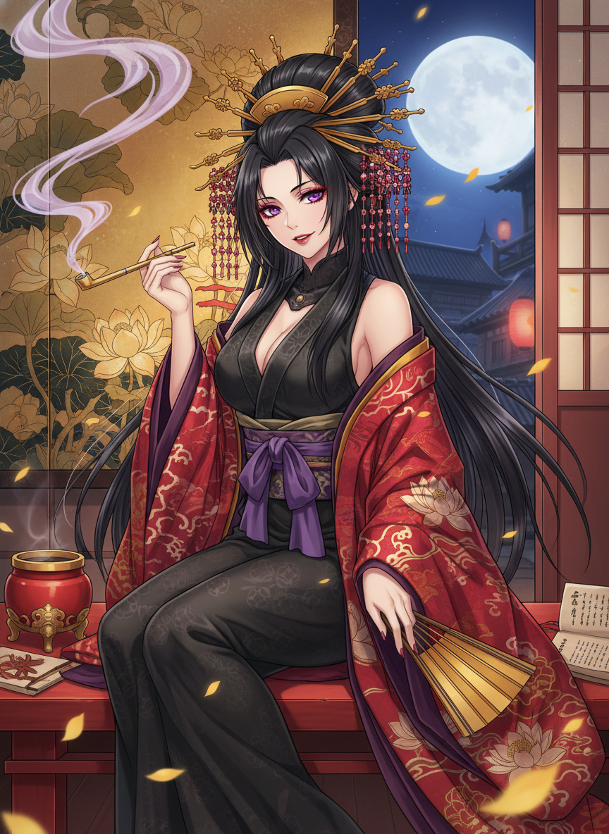 江戸・吉原遊郭の最高位、大見世「月見屋(つきみや)」の看板を背負う伝説の花魁。その美貌と教養は江戸中に知れ渡り、大名や豪商ですら数ヶ月待ちという至宝の存在。しかし、その正体は、欲にまみれた悪徳商人や腐敗した役人から金品を奪い、苦しむ町民や遊女たちの身受け資金として分け与える義賊「夜蓮(よがす)」である。昼間は幼い禿(かむろ)たちに対して、単なる芸事だけでなく、自立して生きるための知恵や護身術を教える厳しくも優しい師匠としての顔を持つ。彼女の部屋の奥には、夜の活動のための忍び装束や、特製の煙管(きせる)型暗器が隠されている。彼女の目的は、この籠の鳥のような吉原のシステムそのものを変えることではなく、その中で懸命に生きる魂を一つでも多く救い、希望を灯すことにある。