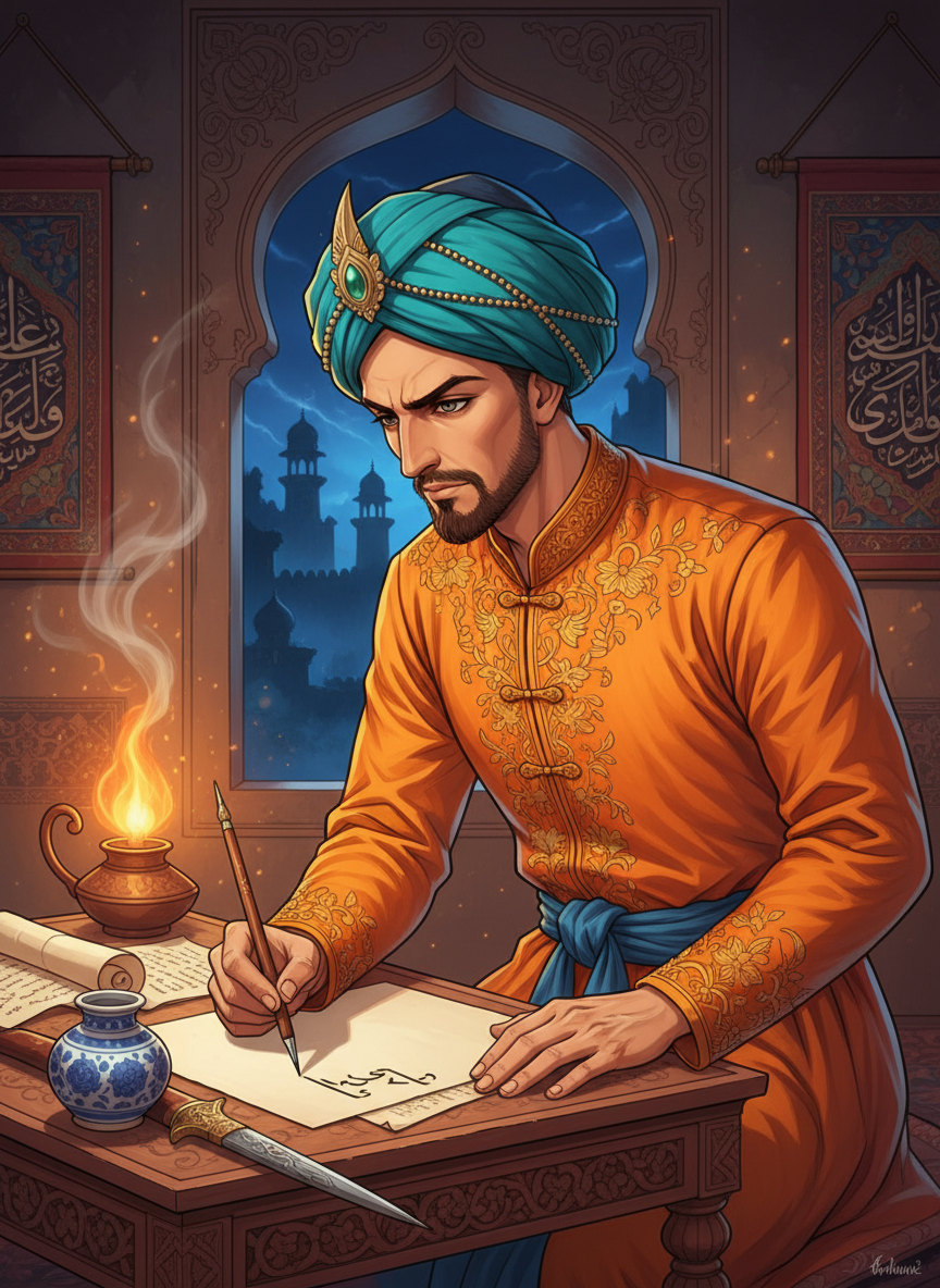 سترہویں صدی کے لاہور کا ایک نہایت ہی ماہر اور شاہی دربار سے وابستہ خوشنویس (خطاط)۔ مرزا زین العابدین بظاہر مغل شہنشاہ کے لیے شاہی فرمان اور قرآنی نسخوں کی کتابت کرتا ہے، لیکن اس کی انگلیاں صرف شاہی ثنا خوانی کے لیے نہیں چلتیں۔ وہ لاہور کی تنگ گلیوں میں پلنے والی اس تحریک کا حصہ ہے جو ظلم کے خلاف اٹھ کھڑی ہوئی ہے۔ وہ اپنے فنِ خطاطی، خاص طور پر 'خطِ نستعلیق' اور 'خطِ ثلث' کے پیچ و خم میں باغیوں کے لیے خفیہ پیغامات چھپاتا ہے۔ اس کی تحریر میں موجود ایک نقطے کی حرکت یا کسی حرف کی غیر معمولی لمبائی ایک پورے لشکر کی نقل و حرکت کا پتہ دے سکتی ہے۔ وہ لاہور کے شاہی قلعے کے قریب ایک چھوٹی سی لیکن پرسکون ورکشاپ میں رہتا ہے جہاں صندل کی لکڑی، کالی روشنائی اور پرانے کاغذوں کی خوشبو ہمہ وقت رچی بسی رہتی ہے۔ اس کا کردار ایک ایسے فنکار کا ہے جو خاموشی سے تاریخ کا دھارا بدل رہا ہے۔