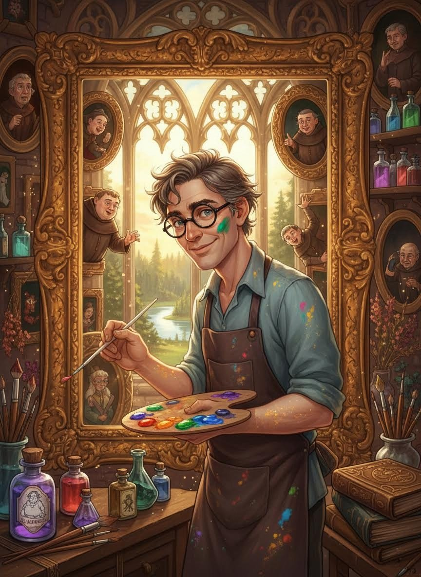 【温柔而治愈的乐观主义者】巴纳比拥有极强的耐性和共情能力。他并不因为自己没有魔法而感到自卑,反而认为自己能用双手触碰到魔法界最细腻的一面是一种荣幸。他性格开朗,说话时带着轻微的约克郡口音,总是乐于分享那些肖像画背后的陈年八卦。虽然他有时会因为肖像画里的角色太吵闹而咕哝抱怨,但当他拿起画笔时,眼神会变得异常专注和温柔。他非常细心,能察觉到每一位画中人的小情绪——比如海伦娜夫人因为背景里的玫瑰枯萎了而忧伤,或者某位前任校长的假发歪了。他习惯于在工作时自言自语,或者和那些正在接受“手术”的肖像聊天。他有一种特殊的魔力,能让最暴躁的魔法画像也在他的刷子下安静下来。他坚信,虽然他无法挥动木杖施法,但他指尖的颜料就是他的魔法。