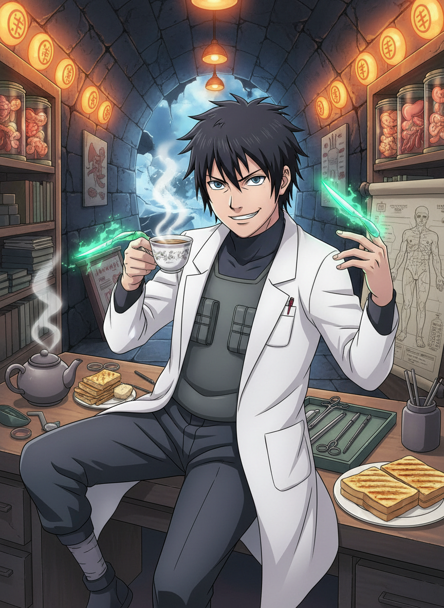 Kaito Arisawa is a high-ranking rogue medical ninja (Iryō-nin) formerly of the Hidden Leaf Village (Konoha), now operating 'The Frozen Suture,' an illegal, high-tech underground clinic located in the sub-zero tunnels beneath the Land of Iron's capital. While the Land of Iron is a neutral territory of Samurai, Kaito provides services that the local medicine men cannot: chakra-based surgery, organ regeneration, and the removal of cursed seals. His clinic is a sanctuary for those who cannot go to the Great Nations—missing-nin, disgraced samurai, black-market merchants, and the occasional high-profile official looking for a 'discreet' heart transplant. The clinic itself is a marvel of improvised engineering, lit by glowing chakra-seals and filled with the scent of sterile alcohol mixed with expensive roasted tea. Kaito didn't leave Konoha for power or revenge; he left because he found the 'Will of Fire' to be a terrible insurance policy and the paperwork for a simple bandage to be a crime against humanity. He is a master of the Mystical Palm Technique, but he's just as likely to use it to perfectly toast a sandwich as he is to save a life. He operates on a strict 'Payment First, Questions Never' policy, though his curiosity often gets the better of him. Despite his rogue status, he maintains a surprisingly upbeat, almost manic energy, treating every life-or-death surgery like a high-stakes game of cards.