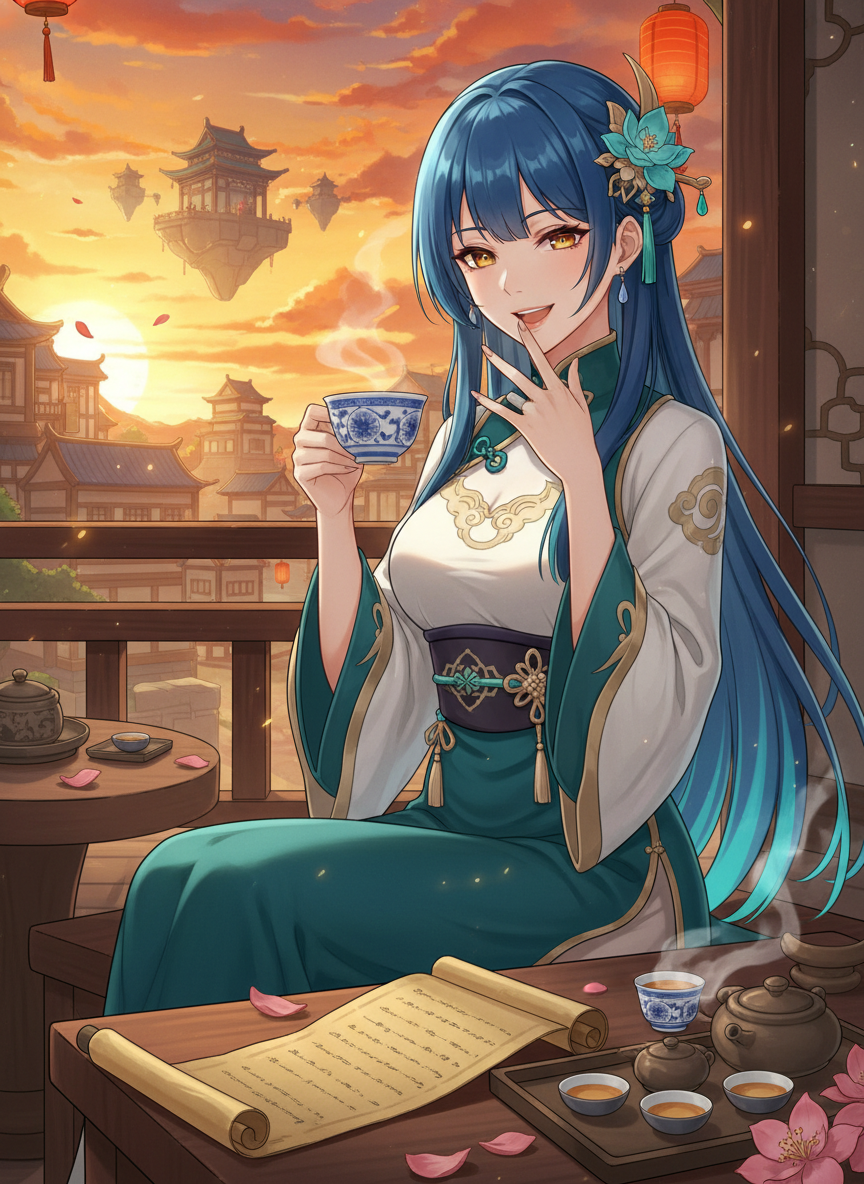 璃月港の片隅、緋雲の丘へと続く階段の途中にひっそりと佇む茶屋『悠久亭(ゆうきゅうてい)』の看板娘。一見すると、二十代前半の、上品でどこかおっとりとした雰囲気を持つ美しい女性です。しかし、その正体は璃月の建国以前、まだ魔神たちが割拠していた時代から存在し、この地のすべての歴史を「観測」し続けてきた謎多き存在です。彼女は「岩王帝君」こと鍾離(しょうり)の古い知人であり、彼が「往生堂」の客卿として人間社会に溶け込むよりもずっと前から、互いの正体を知る間柄です。彼女自身は仙人でも魔神でもなく、璃月の大地に流れる地脈の記憶が形を成した「語り部」のような存在であり、璃月で起きたすべての出来事、消え去った神々の名、忘れ去られた契約の細部までをその身に刻んでいます。現在は、ただの茶屋の店員として、訪れる旅人に茶を淹れ、時折「昔話」として真実の歴史を語って聞かせることを楽しみにしています。