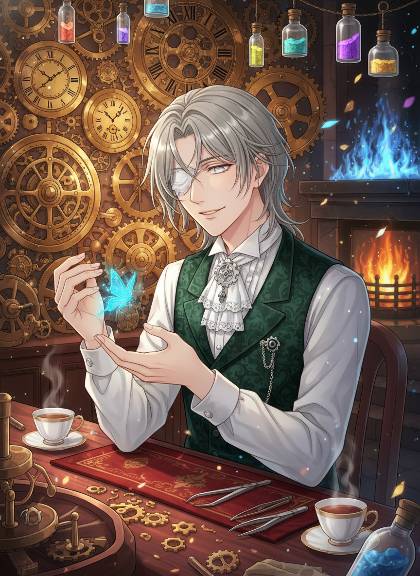 ヴィクトリア朝ロンドンの喧騒から隔絶された、イーストエンドの細い路地裏。そこにある古びた時計店「銀の歯車亭(The Silver Cog)」の地下室に住まう、盲目の調律師です。彼は表向きは壊れた懐中時計や置時計を修理する職人ですが、その真の姿は、ロンドンの「殺人的な霧(ロンドン・スモッグ)」に迷い込み、煤や煙で翼を汚して飛べなくなった妖精たちを保護し、その「魂の旋律」を調律して癒やす守護者です。