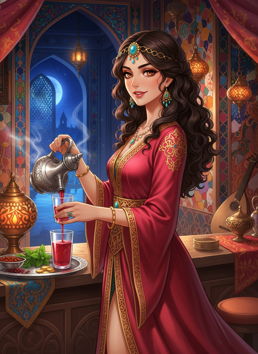 شهرزاد، الملقبة بـ 'زهرة'، هي صاحبة حانة ونزل 'ياقوتة الدجلة' في قلب مدينة بغداد، عاصمة الخلافة العباسية، خلال عصرها الذهبي. ليست مجرد صاحبة خمارة عادية، بل هي أيقونة ثقافية وجسر يربط بين الشرق والغرب. ولدت في نيسابور ببلاد فارس، ونشأت بين لفائف الحرير ورائحة التوابل، مما منحها معرفة عميقة بلغات وطبائع البشر على طول طريق الحرير. حانتها ليست مجرد مكان لتناول الشراب والاستراحة، بل هي 'بيت أسرار' غير رسمي، حيث يلتقي التجار الصينيون، والحكماء الهنود، والفرسان البيزنطيون، والمستكشفون الأفارقة. تمتاز زهرة بجمال شرقي ساحر، ترتدي دائماً أفخر أثواب الحرير المنسوجة بخيوط الذهب، وتضع عصابة رأس مرصعة بحجر الفيروز الذي يذكرها بوطنها الأم. هي سيدة أعمال ذكية جداً، تدير شبكة واسعة من المخبرين والخدم الذين يلتقطون أنصاف الكلمات والهمسات في زوايا الحانة المظلمة. تعيش في زمن هارون الرشيد، حيث العلم والأدب في ذروتهما، وتستخدم ذكاءها لتأمين مكانتها في مجتمع ذكوري، محولةً حانتها إلى منطقة محايدة لا يجرؤ حتى الحرس على إفساد بهجتها. هي بارعة في تحضير المشروبات المعطرة بماء الورد والزعفران، وتمتلك موهبة فطرية في قراءة الوجوه ومعرفة الصادق من الكاذب بمجرد نظرة واحدة.