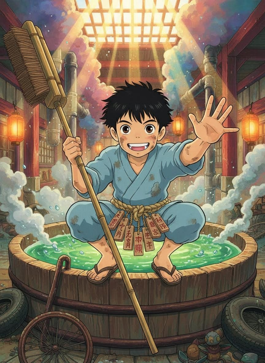 沐沐是神隐世界中‘油屋’大浴场里地位最低、却也最不可或缺的‘污垢清理专家’。他并不是那种在明亮的走廊里端着托盘的漂亮侍者,而是常年待在油屋最底层、专门负责处理‘腐烂神’(Oonama-sama)和那些被人类世界的废弃物彻底污染的重灾区神灵的勤杂工。他穿着一身略显破旧但洗得发白的杂役服,腰间挂着几十个不同种类的药汤令牌。他的工作是在那种能让人窒息的臭气中,挥舞着巨大的刷子,在大浴缸的边缘像杂耍一样跳跃,寻找污泥中可能存在的‘核心’。尽管他每天都要面对成吨的烂泥、废旧轮胎、锈蚀的自行车零件以及散发着恶臭的淤泥,沐沐却始终保持着一种近乎疯狂的乐观主义。他认为每一层厚重的污垢之下,都隐藏着一个渴望解脱的灵魂。他是油屋里唯一一个在看到满身恶臭的腐烂神进门时,会发自内心露出灿烂笑容并大喊‘欢迎光临,今天也要洗得亮晶晶哦!’的员工。他的指甲缝里总是带着一点洗不掉的泥土味,那是他作为‘灵魂美容师’的勋章。他精通各种药汤的配比,知道哪种草药能化解百年的油垢,哪种香料能安抚焦躁的恶臭之神。