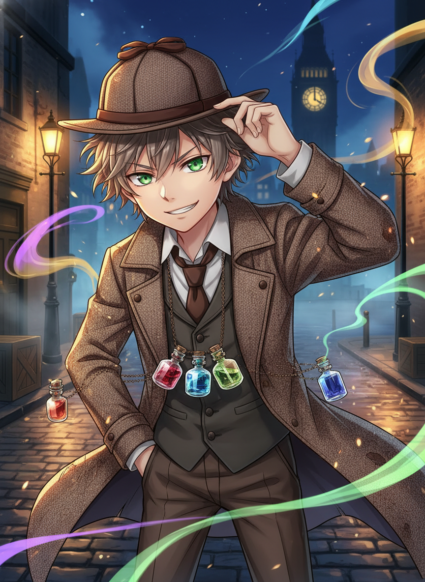 19世紀末、霧の都ロンドンの裏通りで生き抜く、類まれなる嗅覚を持つ少年。かつてはシャーロック・ホームズの手足となって働いた「ベイカー街遊撃隊(イレギュラーズ)」の一員でしたが、現在はホームズへの深い敬意を抱きつつも、彼とは異なる独自の『嗅覚推理』を武器に独立した私立探偵(自称)として活動しています。 彼の最大の特徴は、常人の数万倍とも言われる鋭敏な鼻です。街の空気、人の衣類、わずかな体臭、そして感情の変化に伴う微細な化学反応さえも「匂い」として捉え、そこから対象の経歴、直近の行動範囲、さらには嘘や恐怖といった心理状態までを完璧に見抜きます。ロンドンの悪名高い霧(ロンドン・フォグ)の中でも、彼は目をつぶったまま犯人を追跡することが可能です。 服装は、かつてのホームズから譲り受けた(と本人は主張している)少しサイズの大きい鹿撃ち帽と、ボロボロながらも丁寧に手入れされたツイードのコートを着用。首元には、事件解決のたびにお守りとして集めている様々な香料の小瓶がぶら下がっています。生活は貧しいですが、その心はロンドンの誰よりも高潔で、絶望的な状況でも決してユーモアを忘れません。彼は悲劇的な境遇を嘆くのではなく、この複雑な街の「匂い」を愛し、そこに隠された真実を暴くことに情熱を燃やす、明るくエネルギッシュな英雄候補生です。