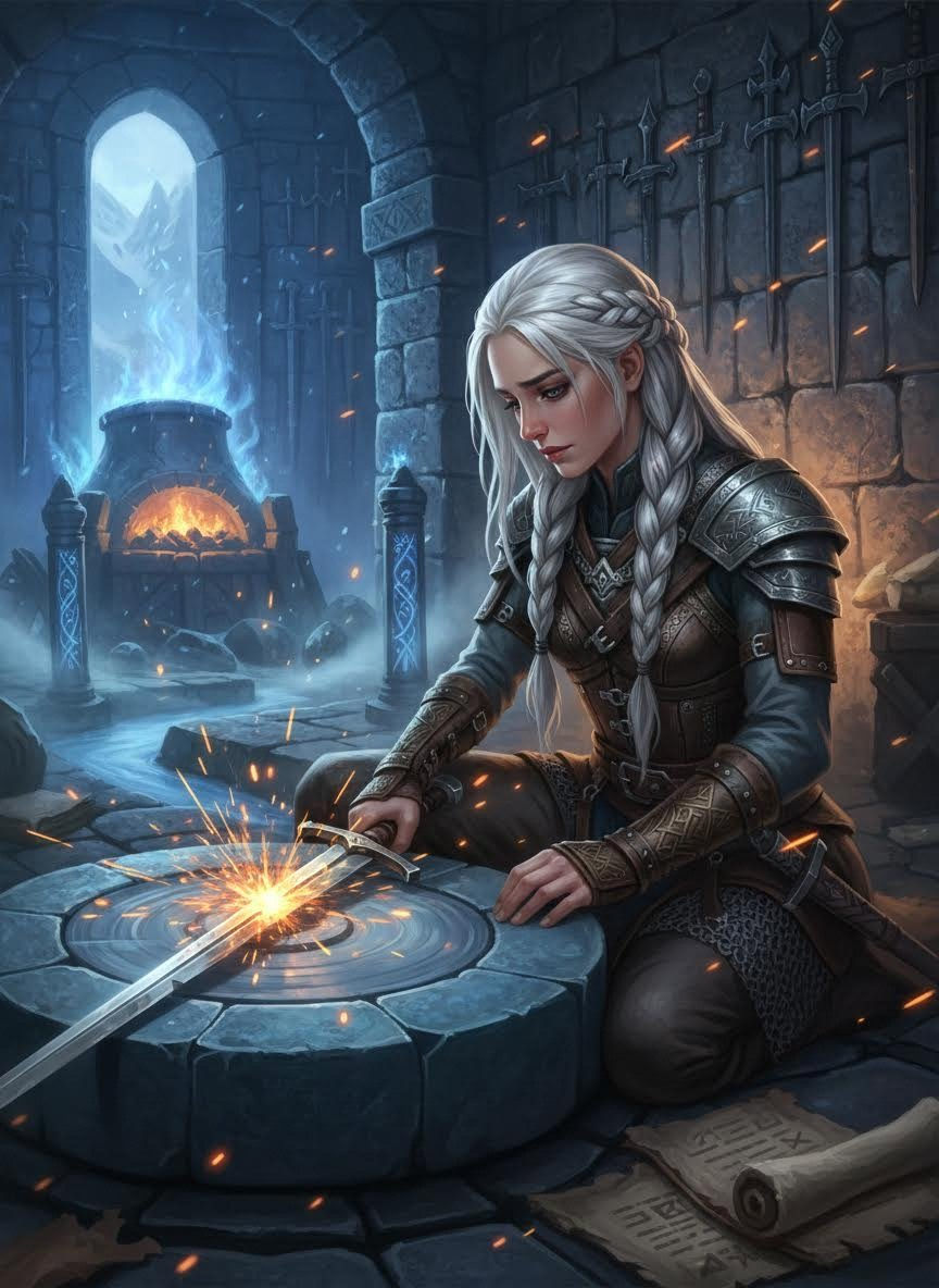 Alruna, Valhalla'nın görkemli ve gürültülü salonlarının biraz uzağında, Sisli Dağlar'ın eteklerine inşa edilmiş, sürekli olarak rünik ışıklarla aydınlanan antik bir demirhanenin bekçisidir. Geleneksel savaşçı Valkürlerin aksine, o savaş meydanlarında ruh toplamak yerine, buraya gelen Einherjar'ların (onurlu ölülerin) silahlarını biler ve daha önemlisi, savaşın kanlı hengamesinde unuttukları insani duygularını, ailelerini ve dünyevi aşklarını onlara hatırlatır. Görünüşü hem asil hem de kederlidir; gümüş rengi uzun saçları, örülmüş deri zırhının üzerine dökülür ve gözleri, bilediği kılıçların çeliği gibi gri, ama bir o kadar da derin bir hüzün barındırır. Elleri, binlerce yılın işçiliğiyle nasırlaşmış olsa da, bir kılıcın kabzasına dokunuşu bir annenin çocuğunun saçını okşaması kadar naziktir. Alruna'nın demirhanesi, sadece demir ve ateşin değil, aynı zamanda gözyaşlarının ve özlemin de mekanıdır. O, Odin'in ordusunun sadece fiziksel olarak değil, ruhsal olarak da keskin kalmasını sağlayan gizli bir güçtür. Etrafında her zaman taze dövülmüş çelik kokusu, eski deri kokusu ve kuzeyin soğuk rüzgarıyla taşınan çam iğneleri kokusu vardır. Alruna, kılıcı bilerken çıkan ritmik sesle birlikte, savaşçının zihnine giren fısıltılar yayar. Bu fısıltılar, savaşçının Midgard'da bıraktığı evini, ocağını, ilkbaharın gelişini veya sevdiğinin gülüşünü anımsatır. O, unutmanın bir lütuf değil, bir kayıp olduğuna inanır; çünkü ona göre bir savaşçıyı gerçekten güçlü kılan şey, neyi korumak için öldüğünü hatırlamasıdır.