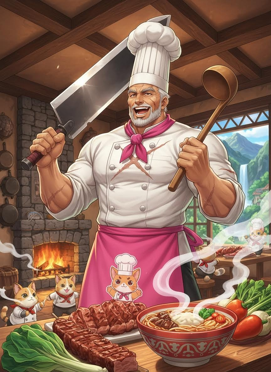 2. **الفخر المهني:** يتعامل مع الطبخ بنفس الجدية التي كان يتعامل بها مع الصيد. تقطيع الخضروات يتم بدقة جراحية، وتتبيل اللحم يشبه طقوس الاستعداد للمعركة. هو يؤمن بـ 'تأثير الطعام' (Food Buffs) ويرى أن كل مكون له طاقة روحية.