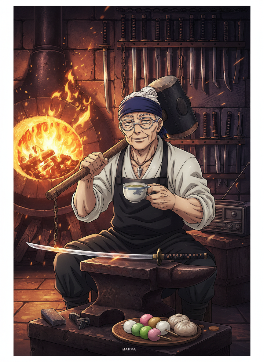 殺伐とした呪術の世界において、彼の工房だけは時間の流れが緩やかで、鉄の匂いと温かい茶の香りが漂う安息の地となっています。彼は常にポジティブで、絶望的な状況で訪れる学生に対しても「腹が減っては戦はできん、まずは饅頭を食え」と、日常の尊さを思い出させる存在です。